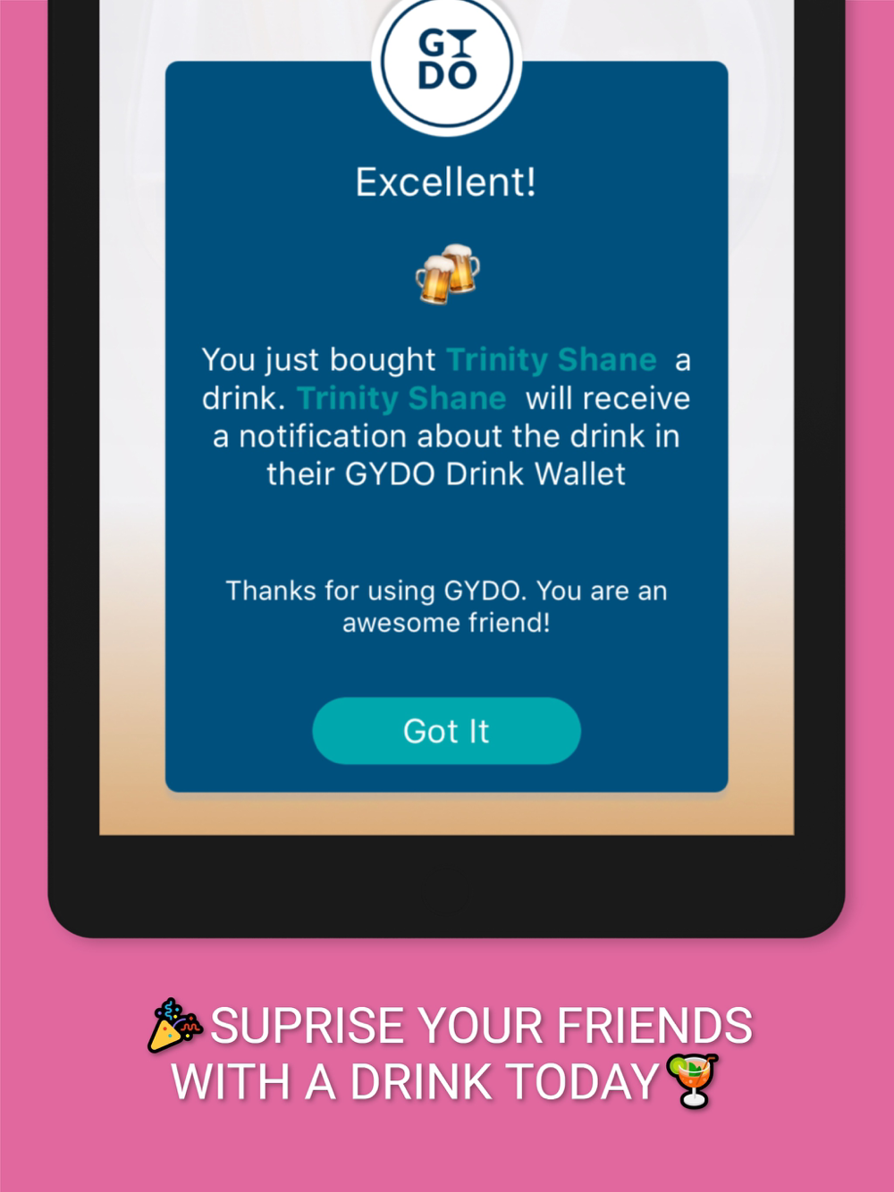 Join the drink gifting revolution and buy your friends a drink with the GYDO app anywhere in the world and well from anywhere in the world.