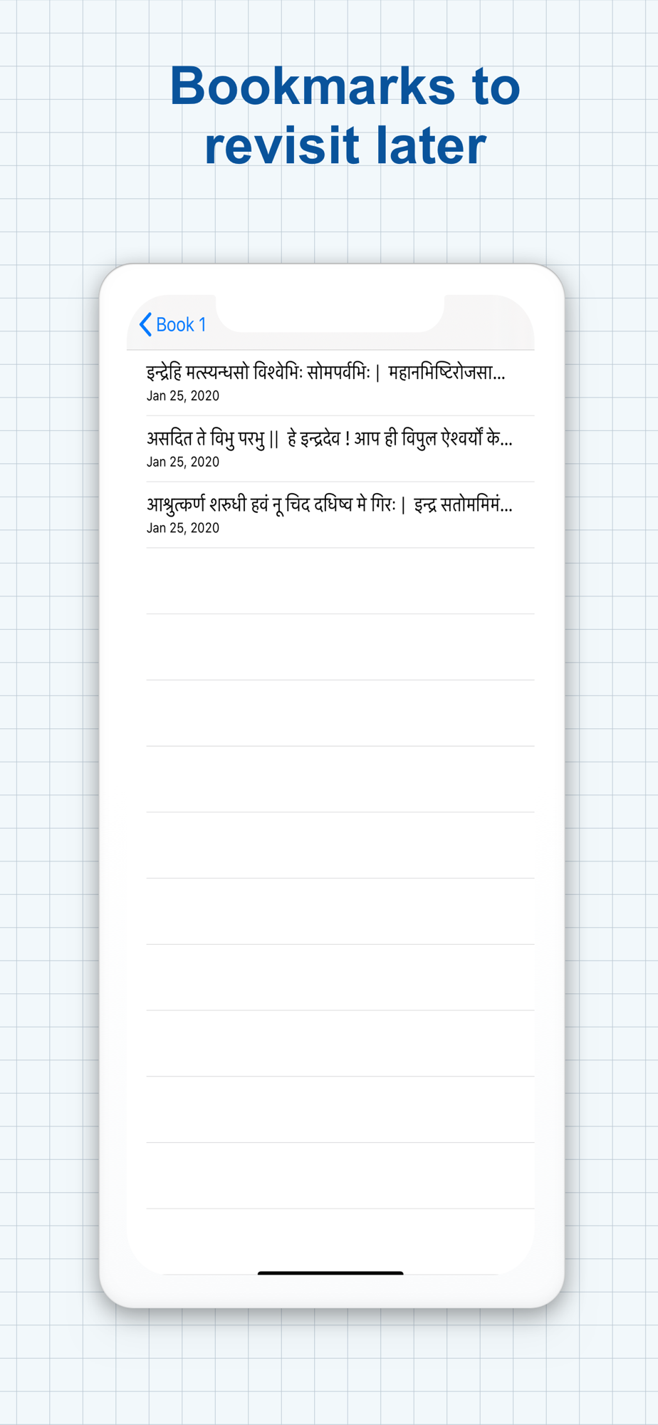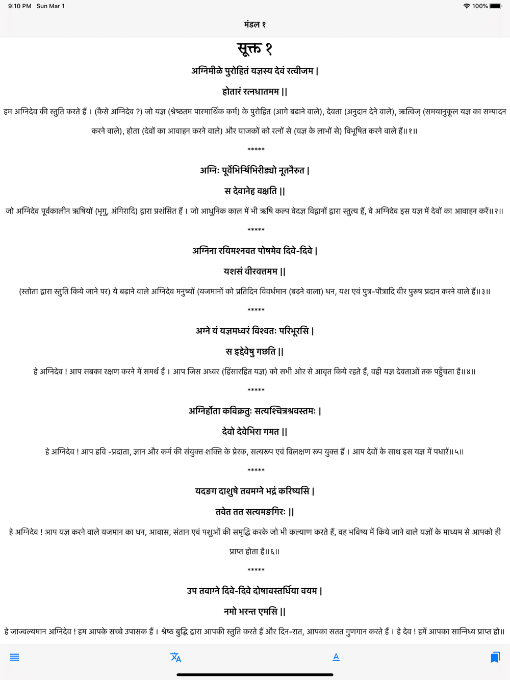 This app brings you all 10 mandals in an easy to read format. The application allows switching between English transliteration (romanized) and original Sanskrit shlokas. The description is available in English and Hindi.