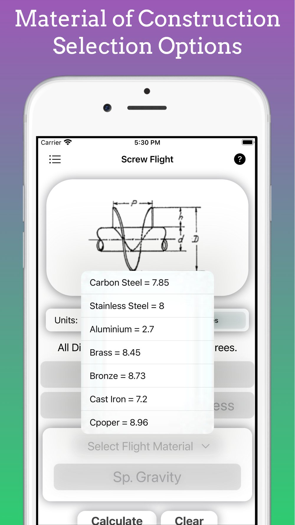 In this App Input is Required Outside & Inside Diameter of Screw, pitch of flight, material thickness & specific gravity of material of Construction such as carbon steel, Stainless steel,Copper, Brass or Bronze material.