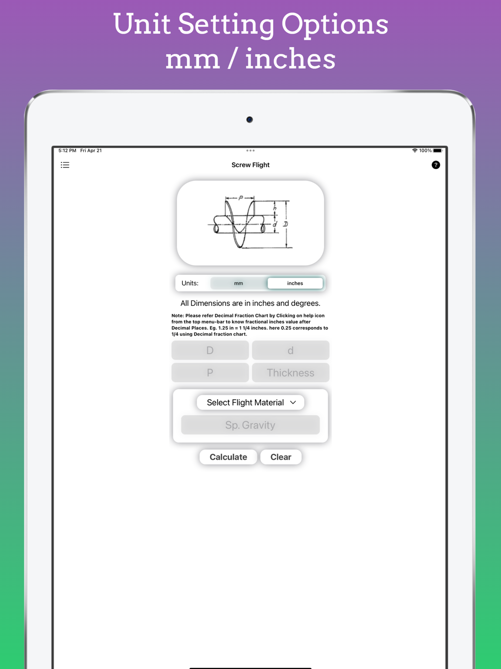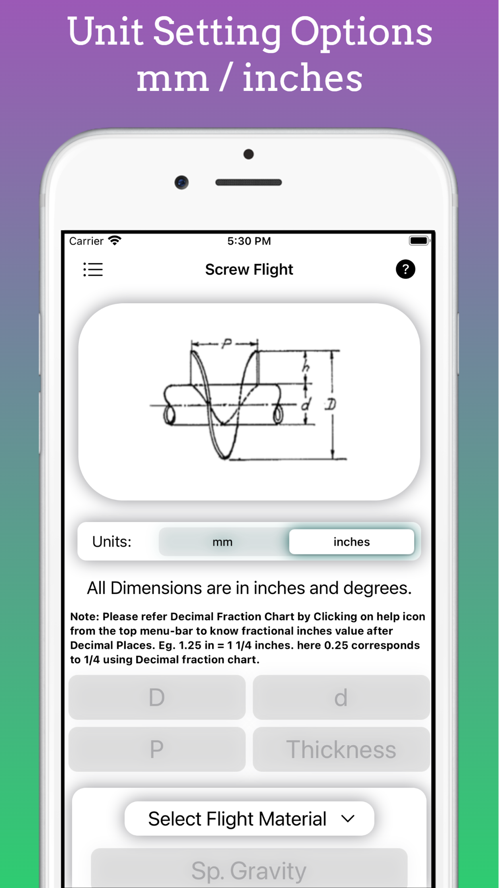 This App is Design to make handy Calculation of Screw Flight development. This app gives Flat pattern Size for Cutting Blank plate for development or fabrication of Screw flight. This app is very useful for those who are working in the field of Screw Conveyor or Ribbon Blender fabrication.