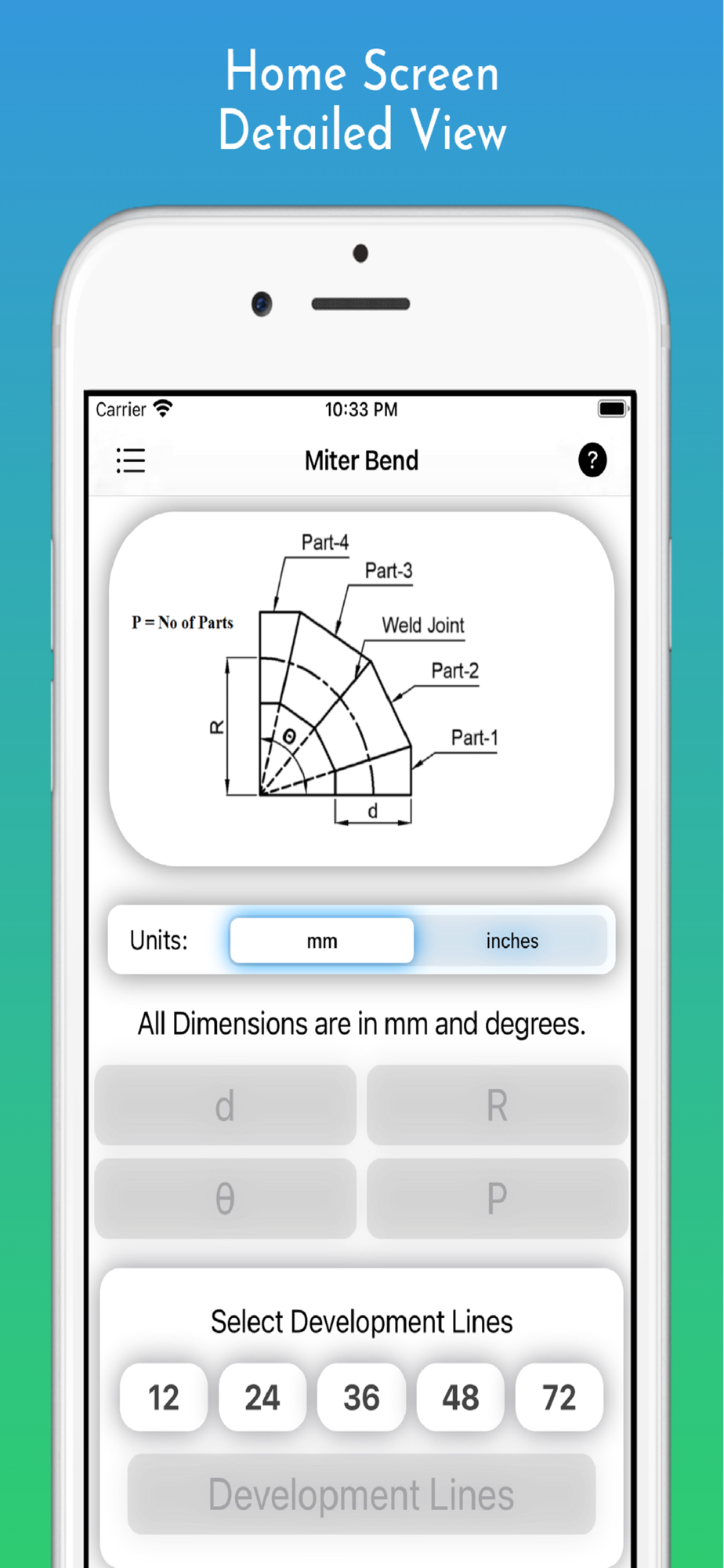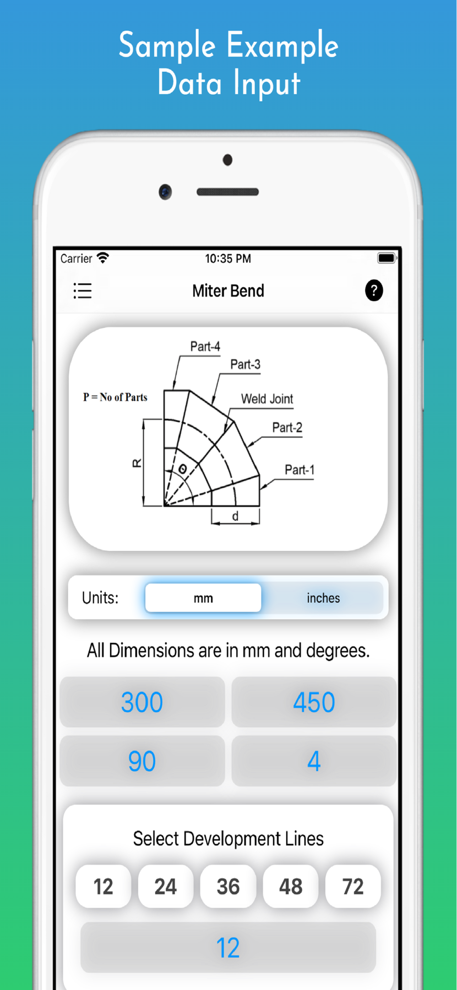 In this app all Dimensions are used in MM and Inches to Calculate Marking so please enter your Input Dimensions in MM and Inches to get a correct solution or correct layout of Miter Bend.