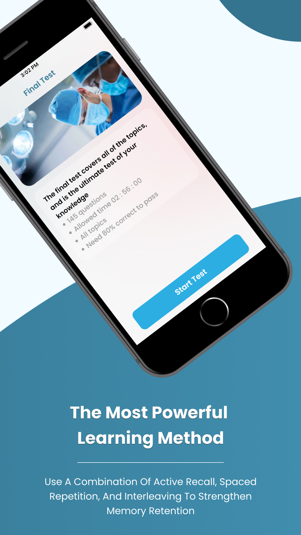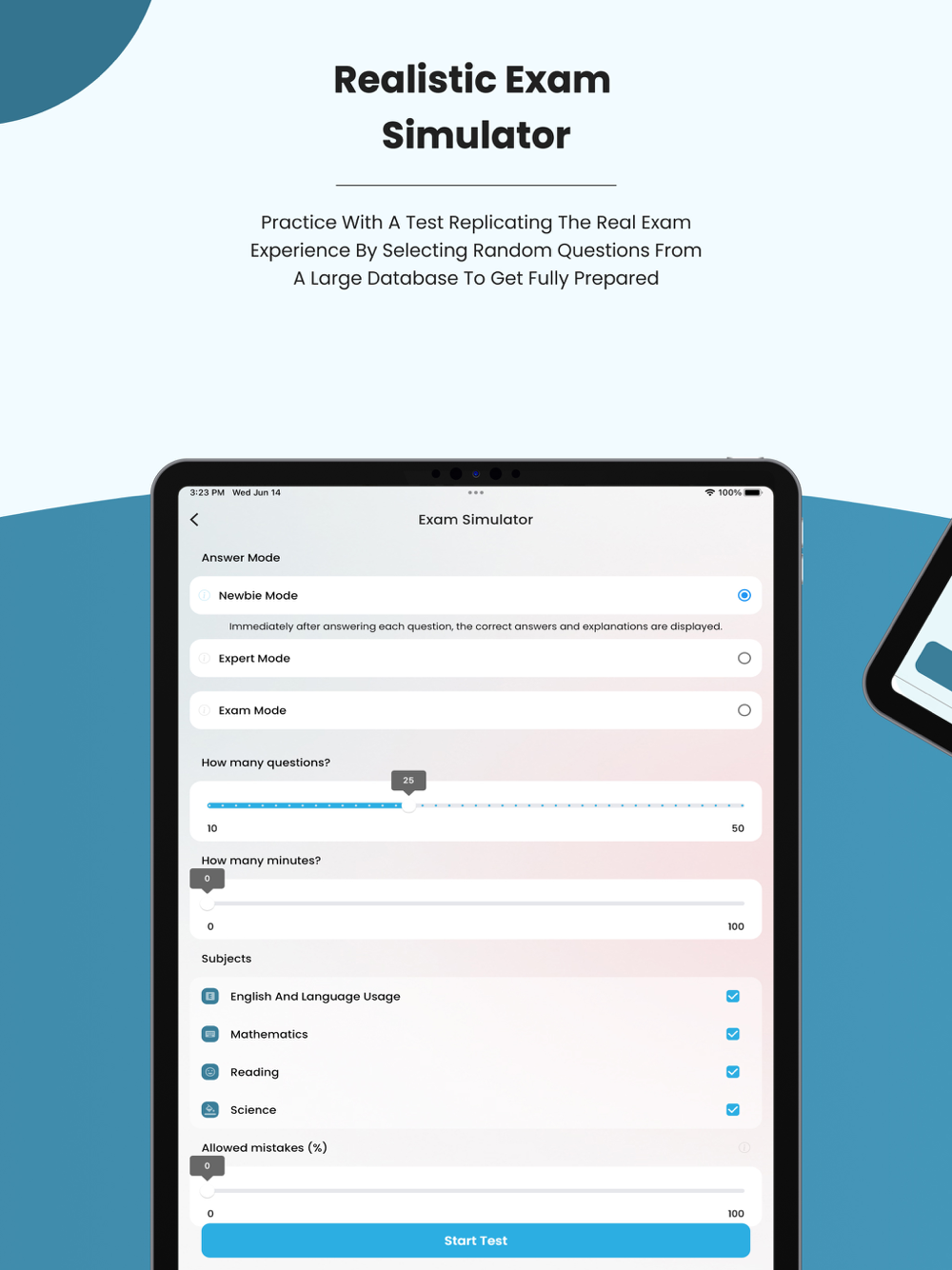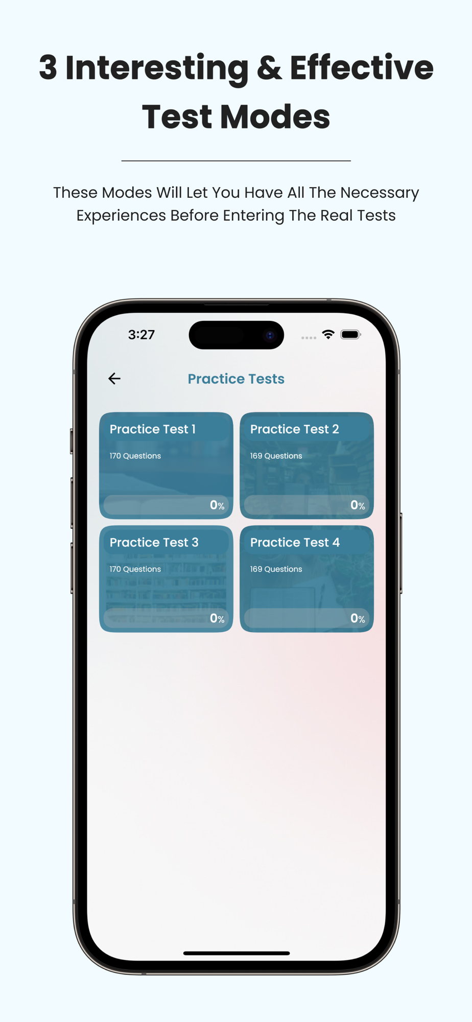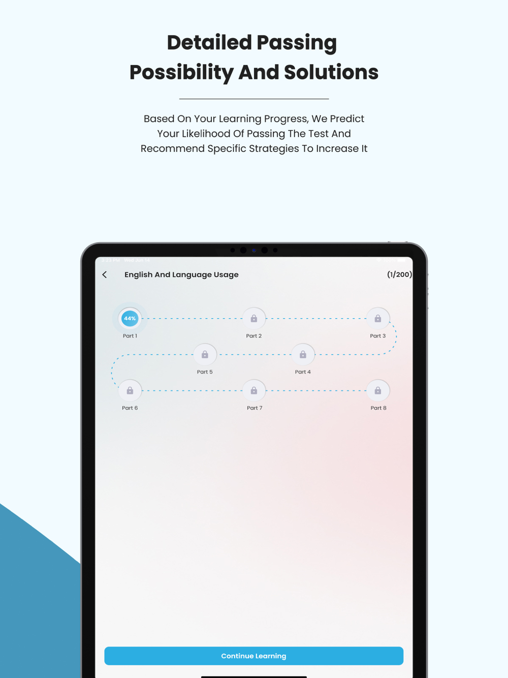 • Mock test: Mock test simulates the real test format. When you finish the test you will see your score and review all the questions.