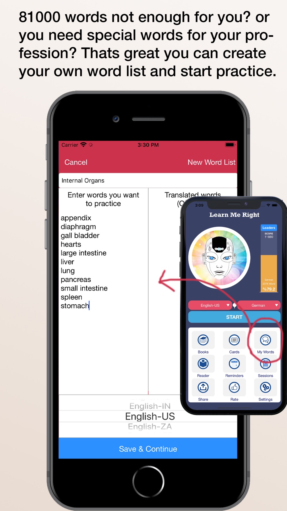 * 81000 words not enough for you? or you need special words for your profession? That's great you can create your own word list and start practice.