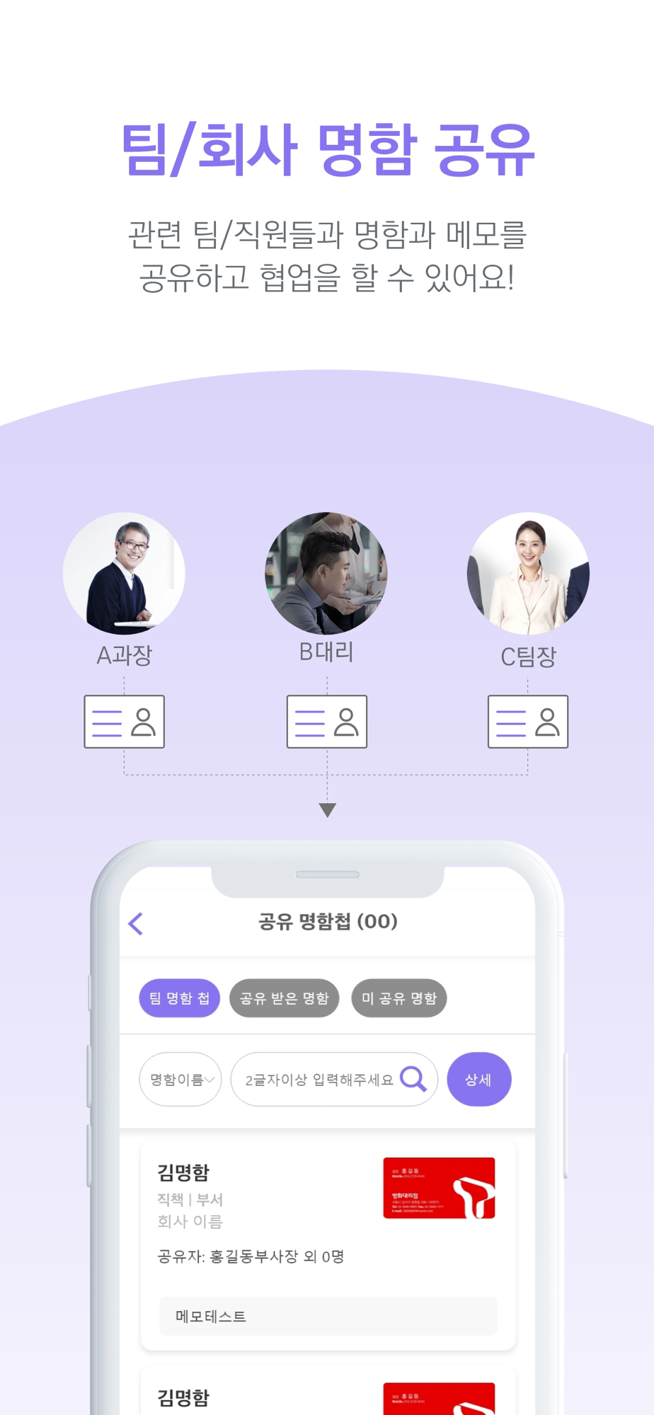 - 휴대폰 주소록, MY 명함첩, 팀명함첩, 회사 명함자산으로 자동 등록
