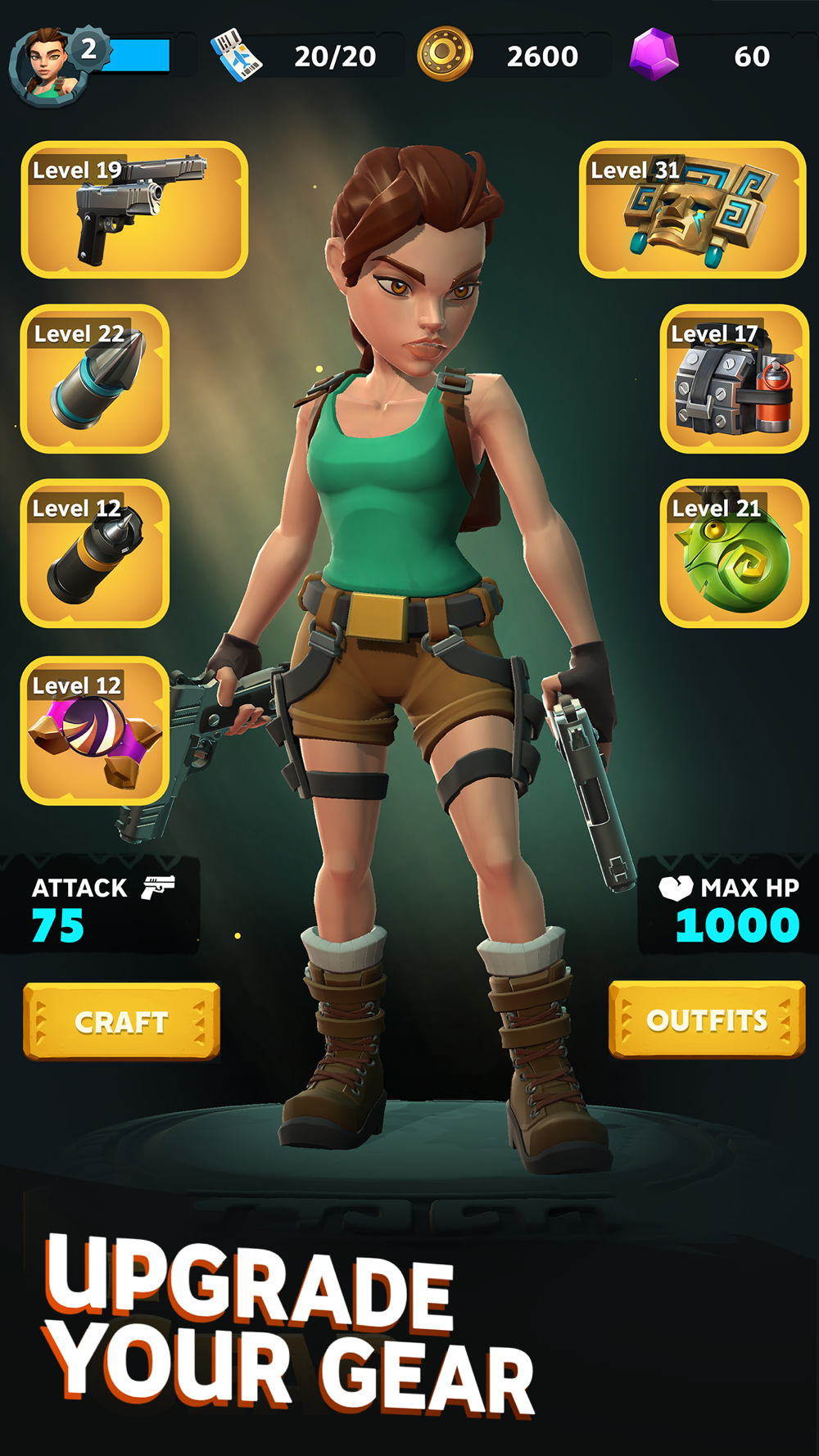 Dropping to a knee after an epic run doesn’t signal the end! You’ll be awarded a trove of coins and experience points to upgrade Lara’s outfits and weapons, increasing your base attack and HP stats.