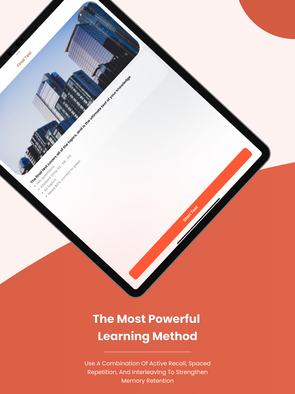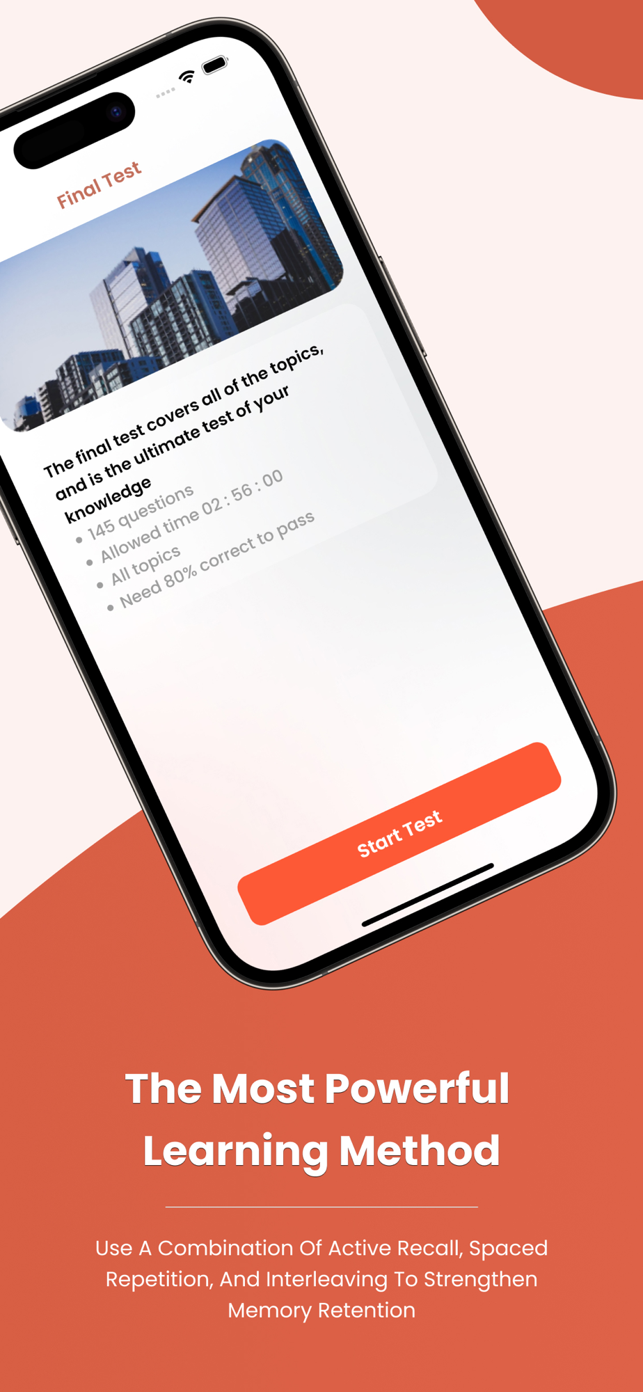 • Mock test: Mock test simulates the real test format. When you finish the test you will see your score and review all the questions.
