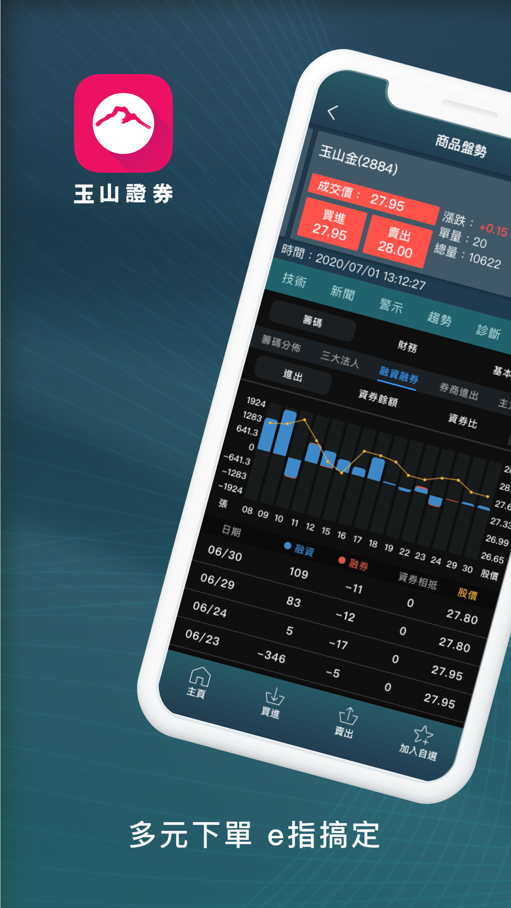 玉山證券E-Trader提供完整的證券、複委託、權證、期貨及選擇權等豐富的市場行情,便利直覺的下單介面,視覺化的資訊,提供完整報價、快速下單!