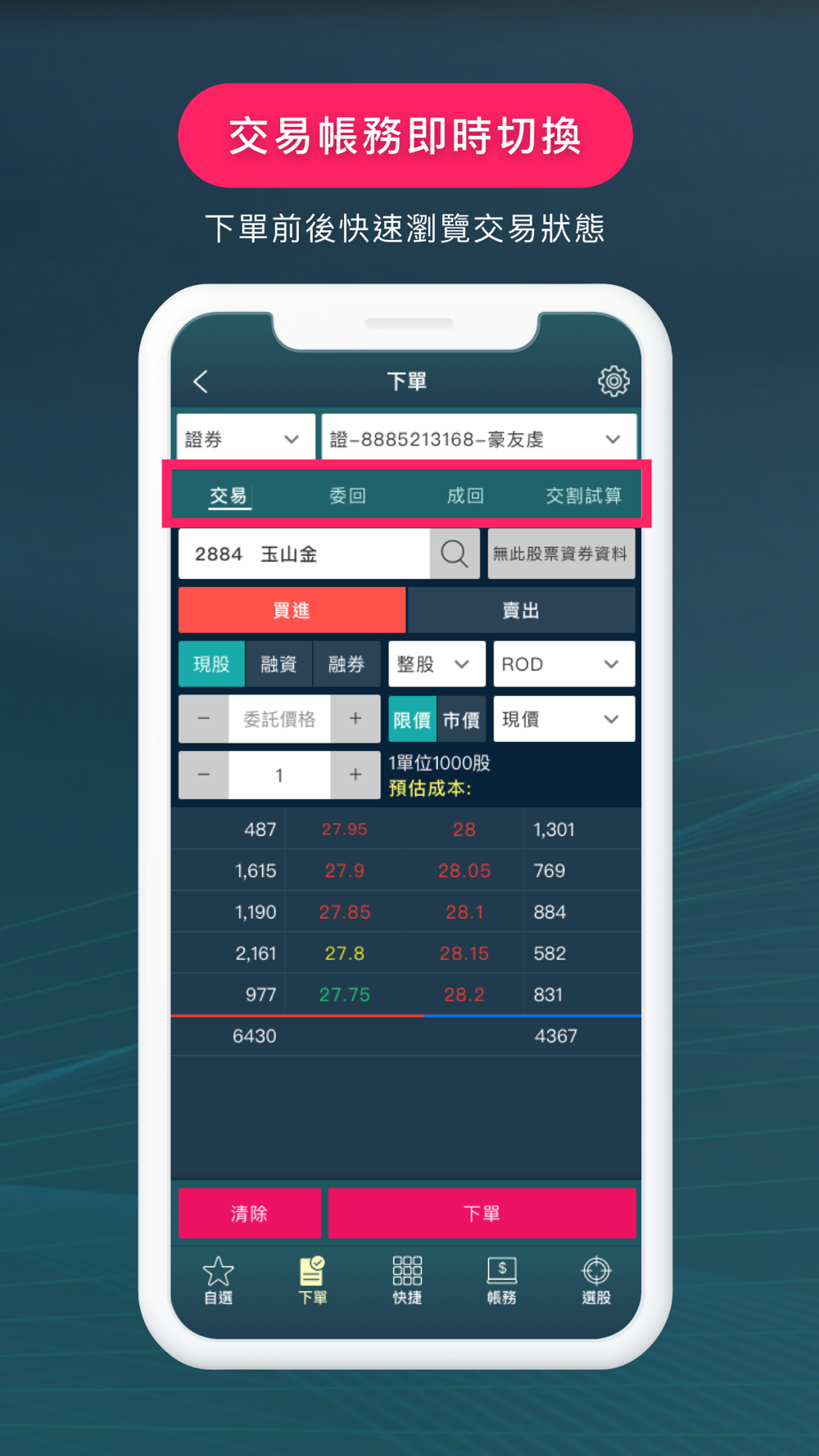 下單功能-下單介面簡易直覺化,提供證、期權、港美股多元產品交易。
