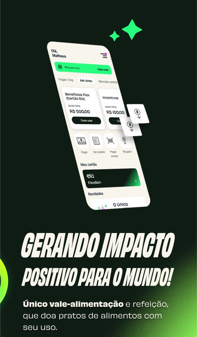 Todos os seus benefícios (vale refeição, vale alimentação, bem-estar para uso em academias, mobilidade, combustível, auxílio farmácia e muitos outros) presentes em um só lugar, na palma da sua mão e em um único cartão.