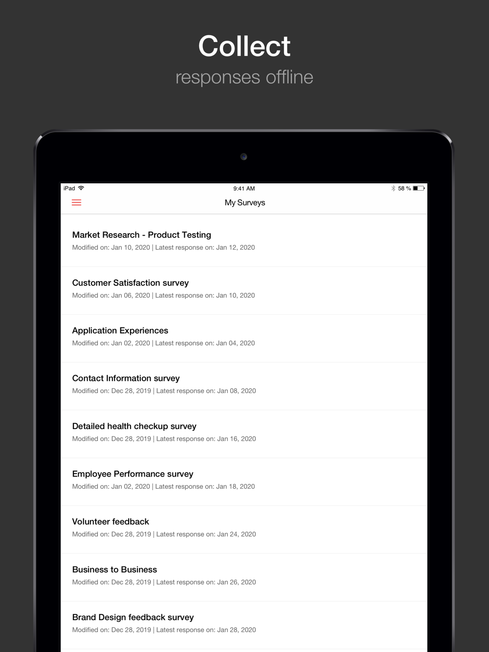 Choose a survey from your list and start collecting responses on your iPad, without worrying about connectivity issues. Offline collection is great for collecting feedback at tradeshows, field sales visits, check-out counters, mall kiosks, and any other places you need to survey people.
