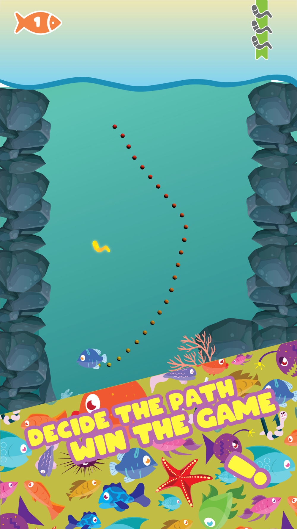 In this game, you need to complete the levels with taking all the baits. For doing that, you have to be carfeful and avoid fishes to crash