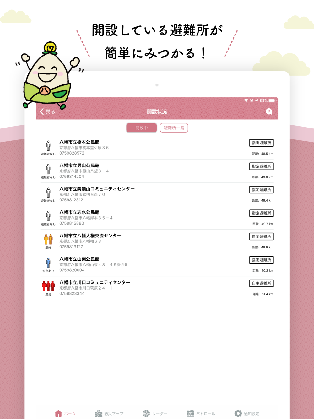 ・防災マップ(避難所や避難場所、ハザードマップ)の表示