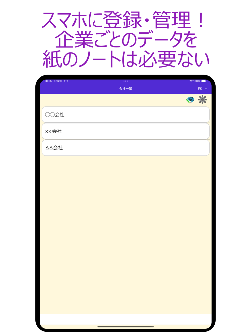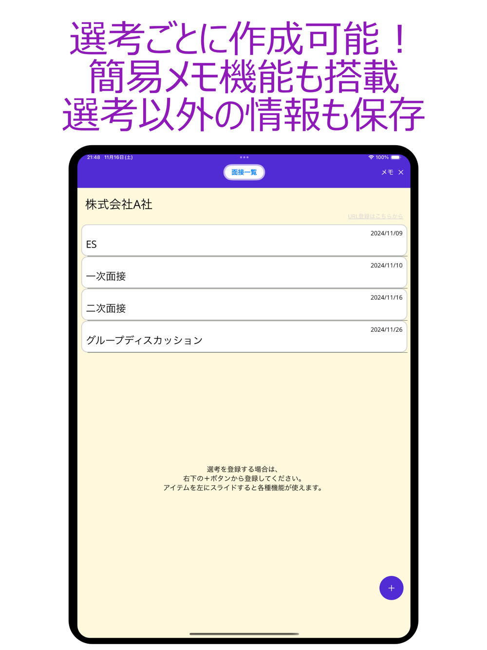 このアプリは、会社ごとにデータを管理し選考での問答や日時、面接官の名前などを保存しておくことができます。これにより次の面接の前に何を発言したかなどの確認ができ、選考を通して一貫した内容の発言をすることができます。また、スマホで管理するため、いつでもどこでも確認入力をすることができます。