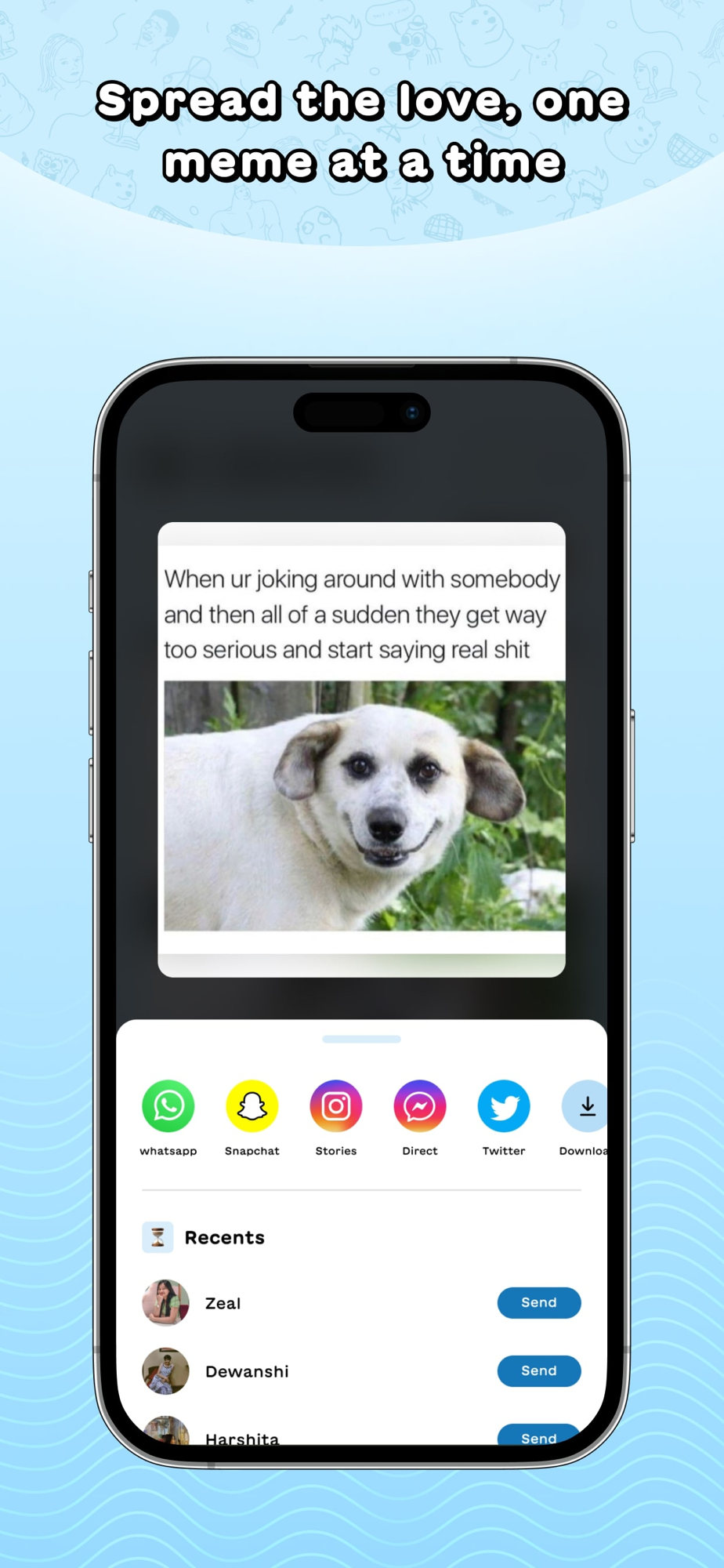 - Got a personal favorite? Hold on to the meme with our slick bookmarking feature and share the laughs with your matches or friends, on or off the app!