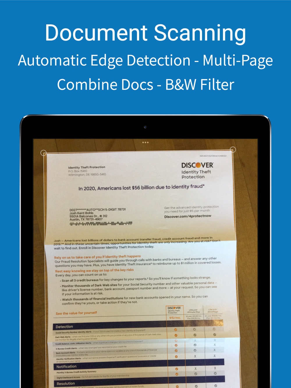 -Scan multi-page documents with smart edge detection; edit, annotate, and save as PDF (supports PDF 1.3, 1.4, 1.5, 1.6, 1.7, and all PDF/A subtypes).
