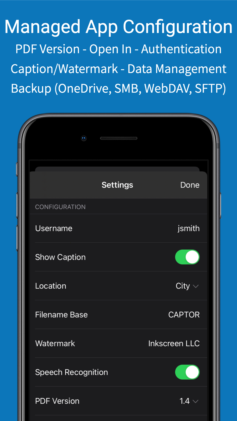 Employees who capture photos, record audio/video, and scan documents on the job can remain productive while satisfying even the most stringent IT data protection policies. Captured content remains in an encrypted container on the device or can optionally be backed-up to a managed network drive, cloud storage, or content server.