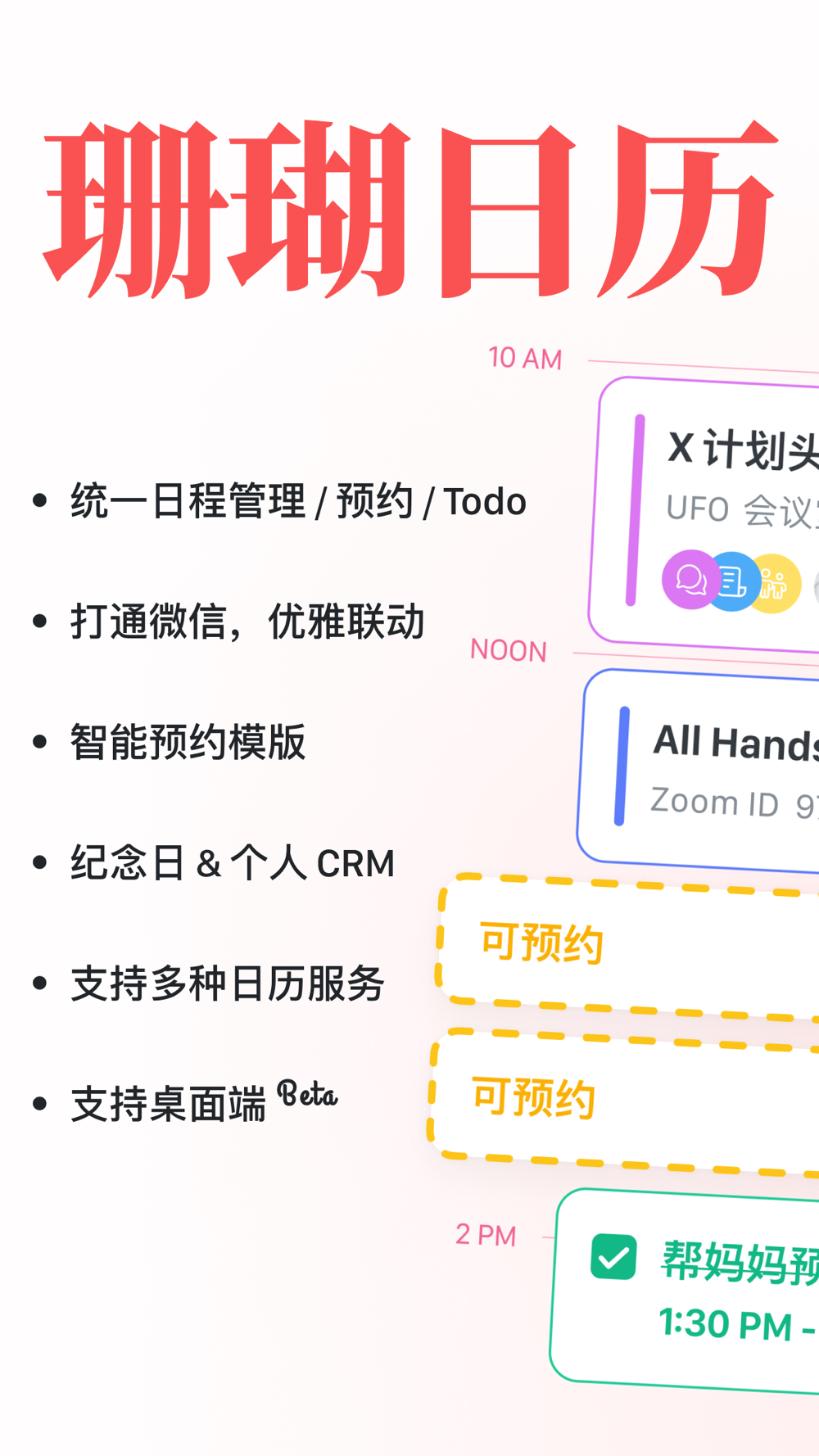 珊瑚日历是新一代 all-in-one 时间管理工具,打通微信,一处管理日历/日程/待办,助你轻松安排工作与生活!