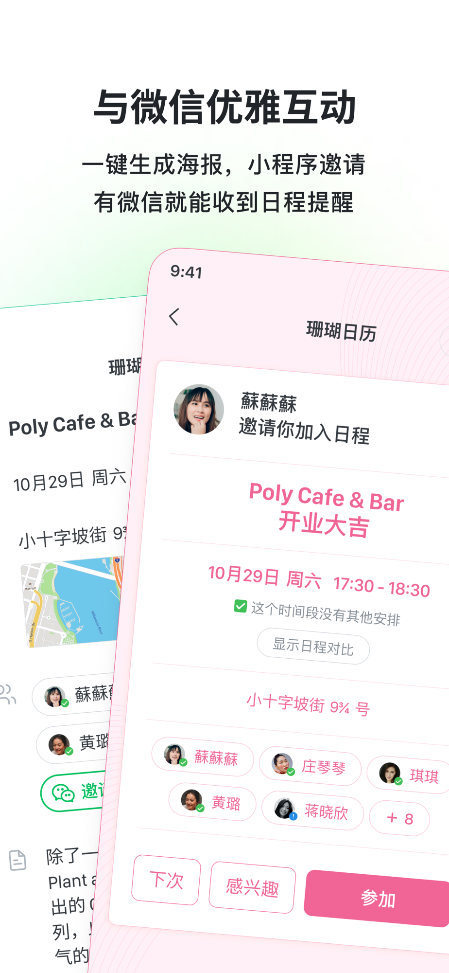 - 智能预约模板:珊瑚日历会自动标出你的空闲时间,无需来回询问,让好友直接发起日程