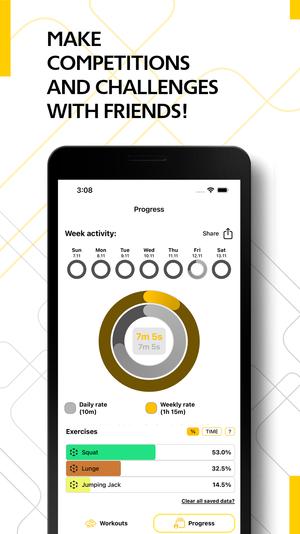 Just provide the target number of exercises and ask to share the result. Recognition technologies of Apple AI will calculate the result, and you will always know the fit progress. Make the process funny and joyfull. Organize trainings as a challenge or provide prizes for weekly trainings. Start with one minute training per day for you friend.