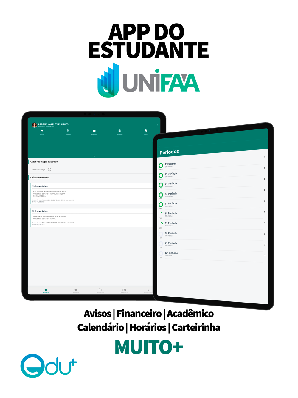 O Aplicativo do UNIFAA, foi pensando para facilitar o acesso as informações da vida acadêmica do aluno na palma da mão. Com ele você possui comunicação direta para solicitação e envio de documentos e declarações além de receber avisos encaminhados pela instituição ou professores. Acompanhe datas de provas, notas, faltas lançadas e a carteirinha do aluno, função disponível para modo off-line. Realize pagamentos via boleto, consulte parcelas abertas, pagas, e data de vencimento.