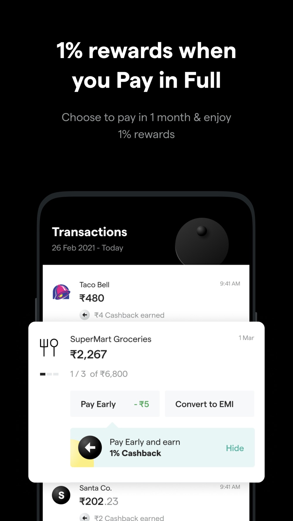 1. Pay 1/3rd for all your transactions - Divide your spends in 3 parts for 3 months for no extra charges. A bill of ₹15000 is divided into 3 payments of ₹5000 for the next three months.