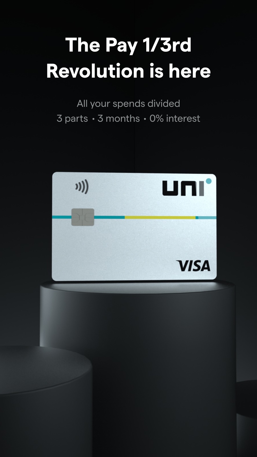 Uni Pay 1/3rd Card - backed by VISA - Pay 1/3rd, get 1% rewards & enjoy 6,9,12,18+ months EMI plans.