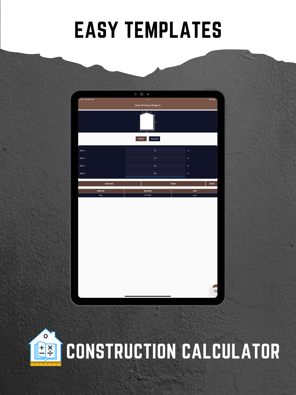 Construction Calculator Free can calculate with the Imperial Measurement System & Metric Measurement system.