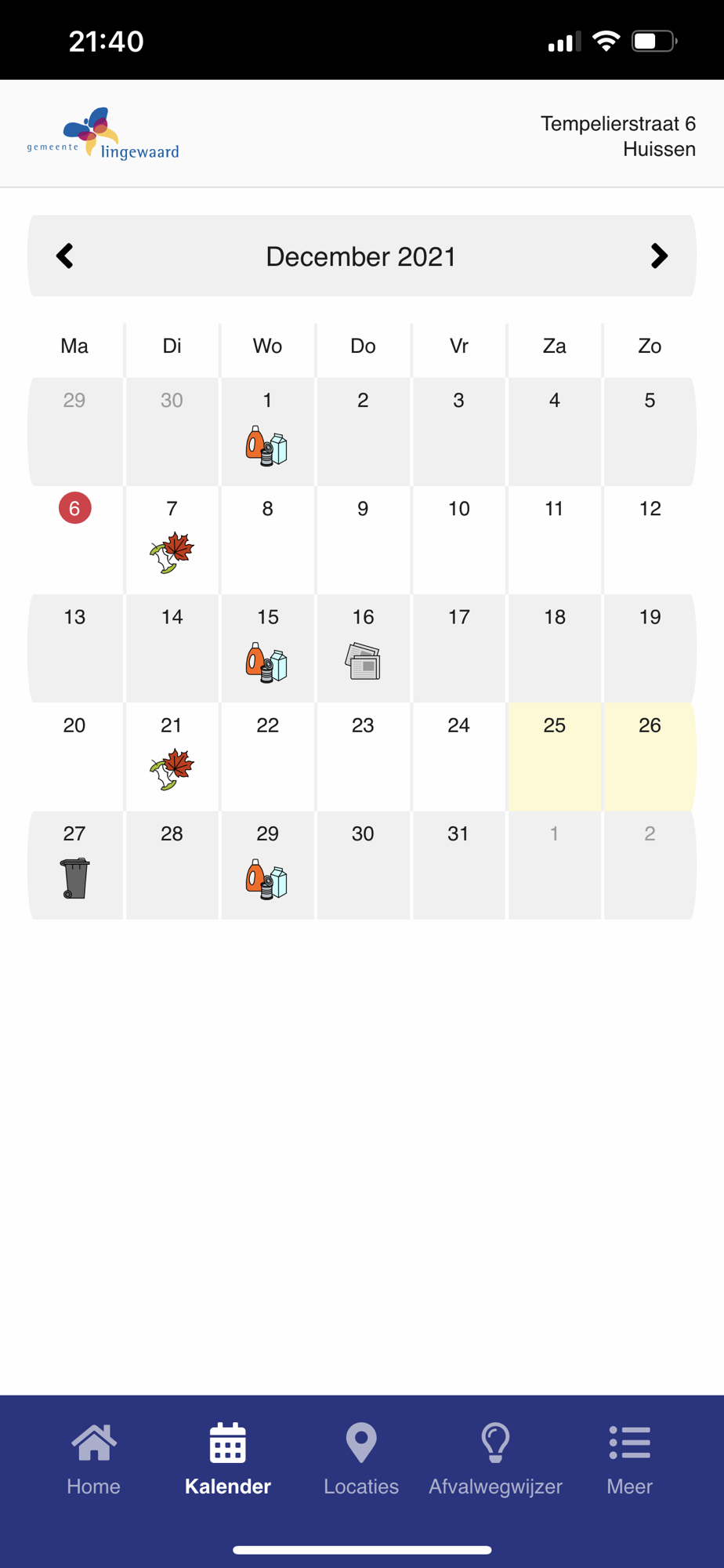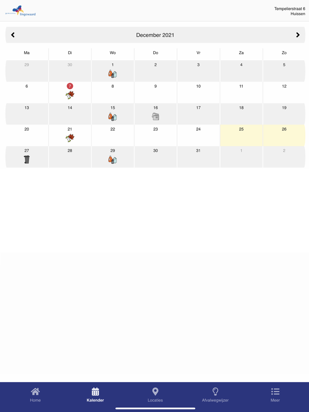 Woont u in de gemeente Lingewaard? Voer dan uw postcode en huisnummer in. Vervolgens ziet u in de digitale afvalkalender alle informatie over het scheiden van het huishoudelijk afval en het aanbieden van huishoudelijk afval. U kunt tevens een push-bericht ontvangen wanneer het afval aan de straat gezet kan worden.