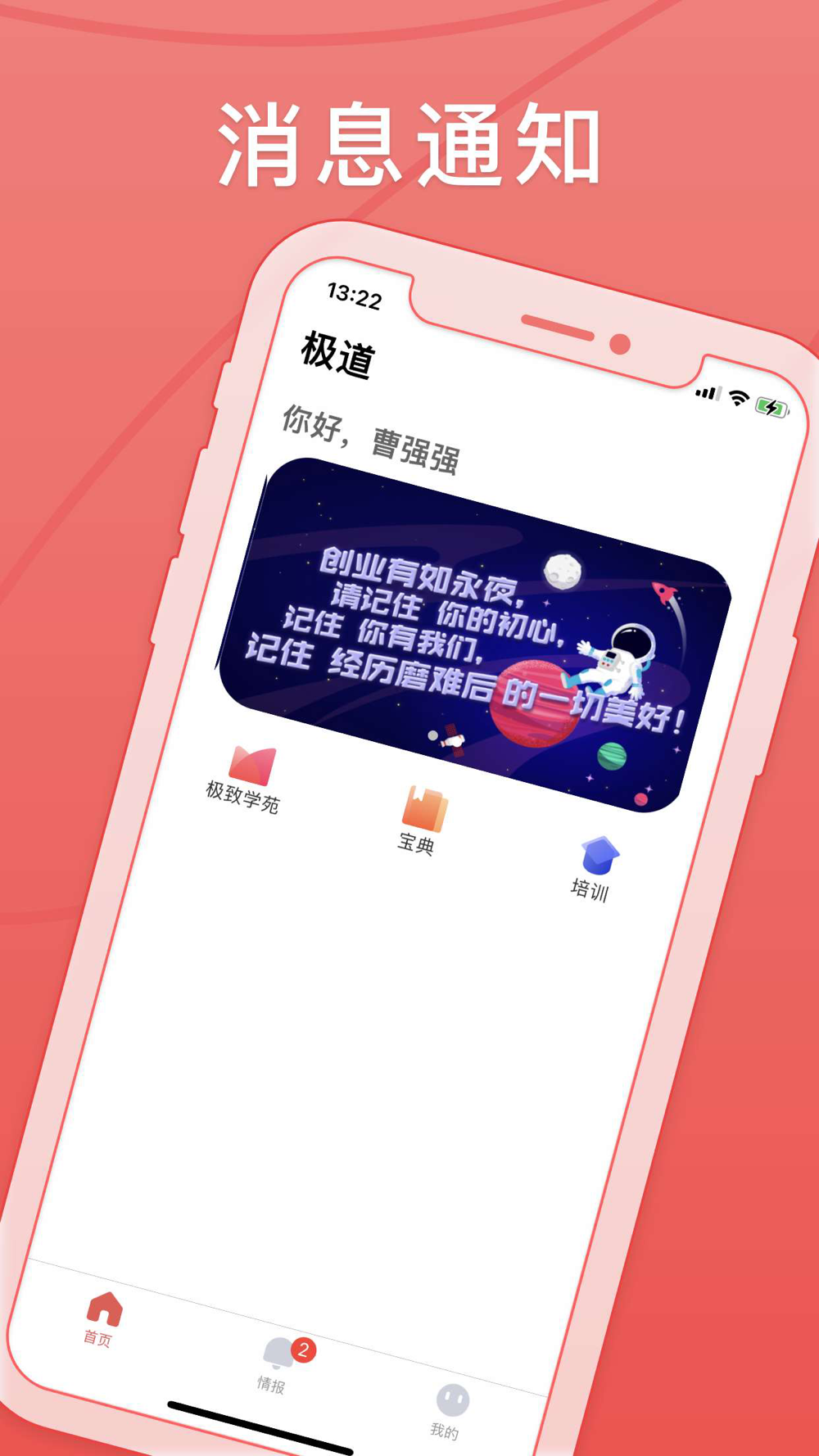 「极道」是企业内部员工移动学习和考核管理系统,辅助员工了解企业文化,业务操作等信息,功能包含「学院」「宝典」「培训」「情报」