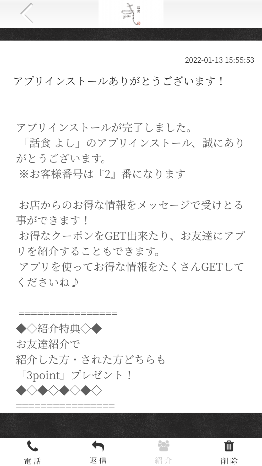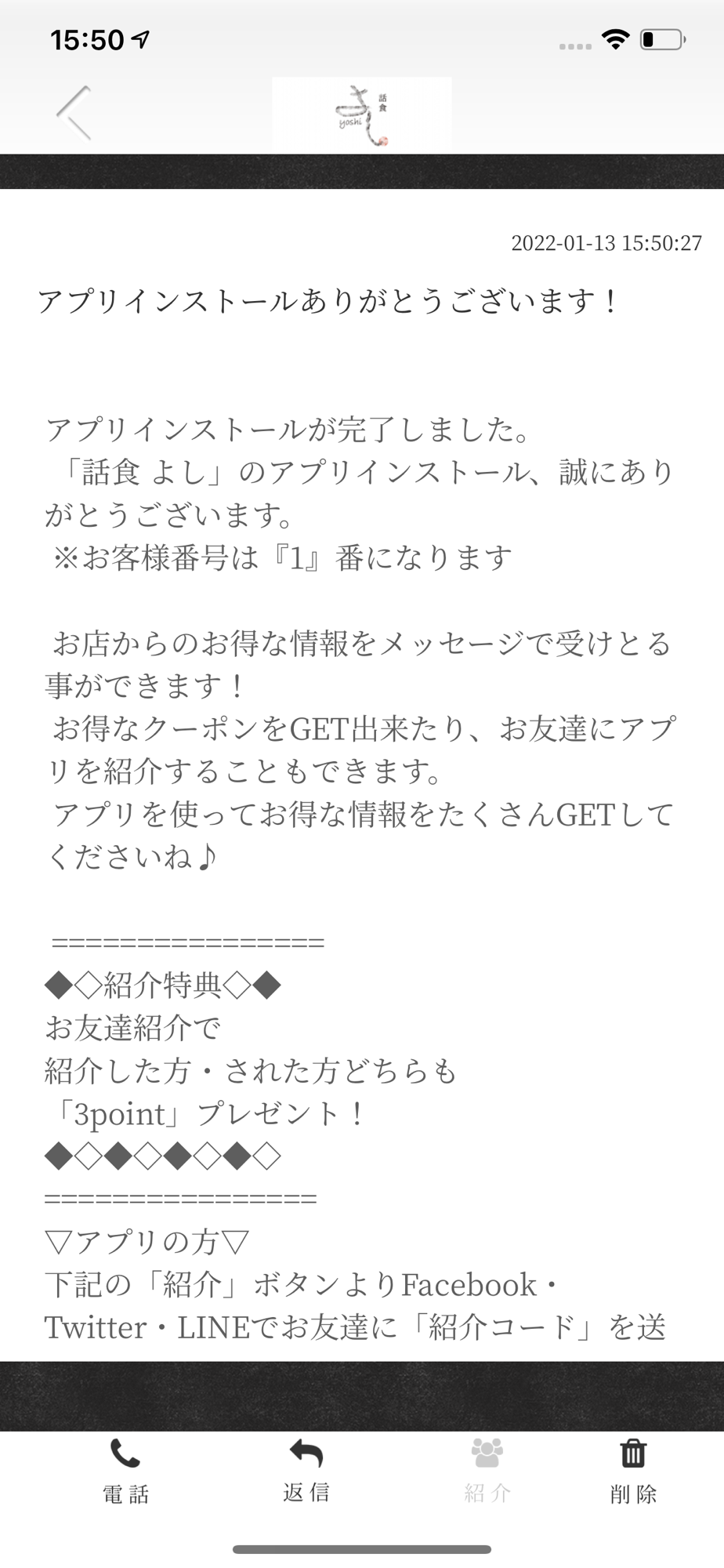 話食 よしのアプリをSNSを通じてお友達に紹介する事ができます。