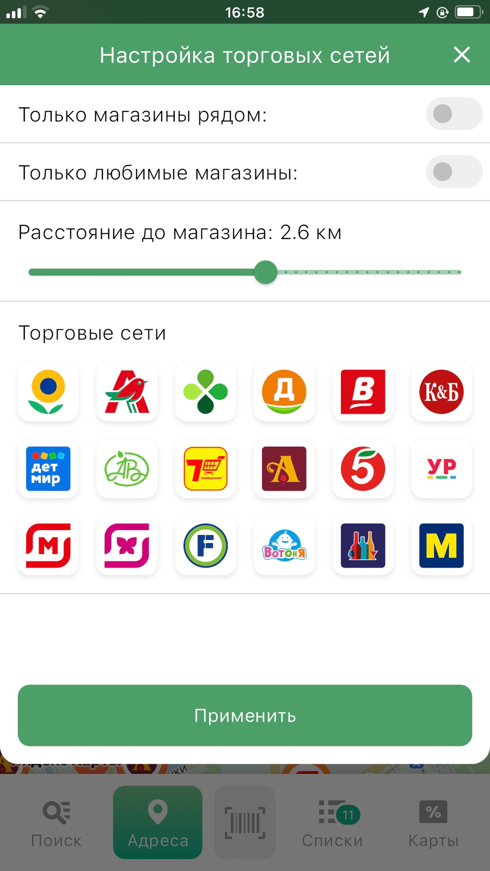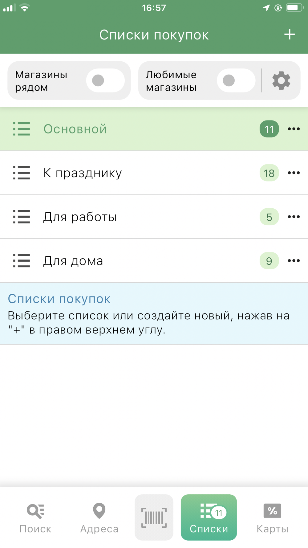 При помощи приложения Вы найдёте продукты с выгодными для Вас ценами в ближайших магазинах. Составить список Вы сможете как через строку поиска, так и сканируя штрих-код или по рубрикам каталога.