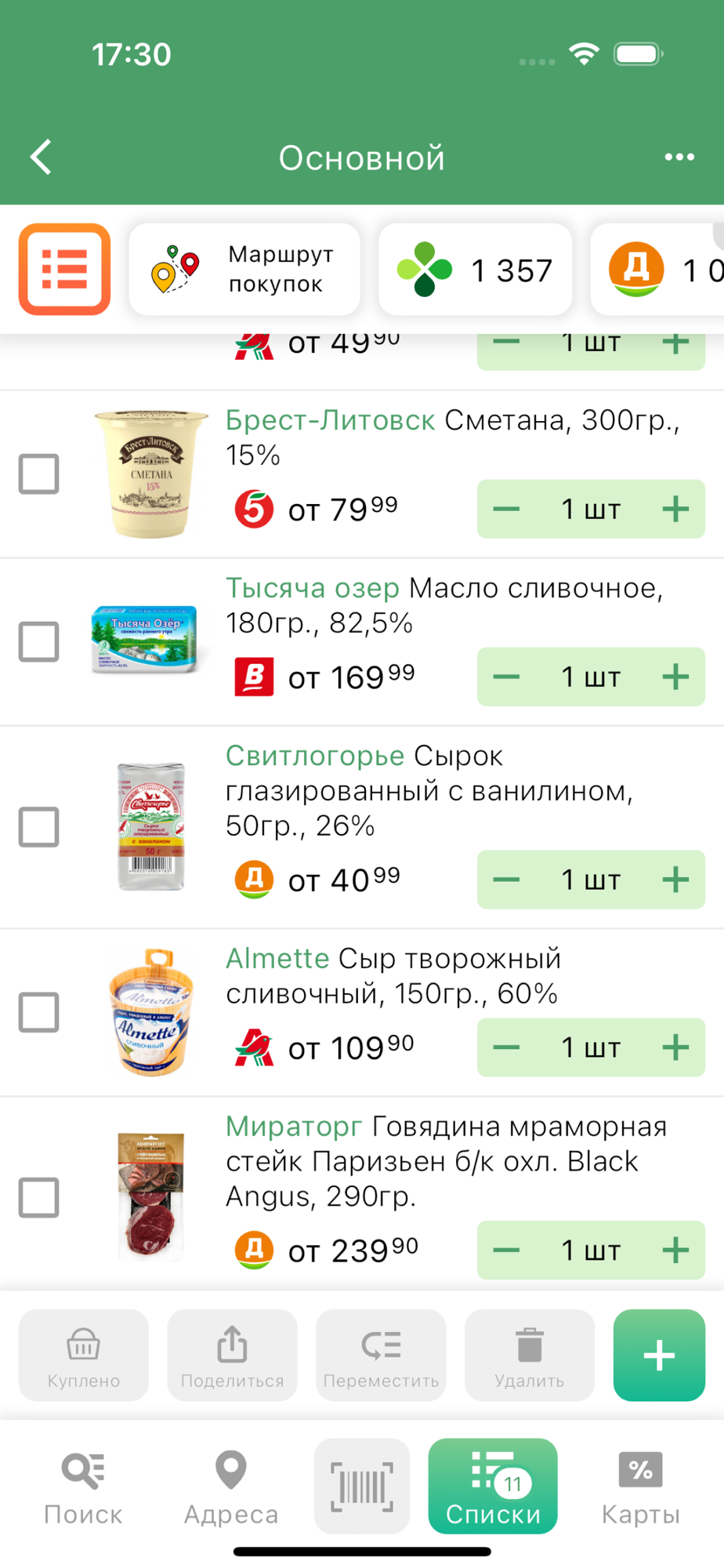 Приложение позволяет сравнить конечную цену за весь список покупок в разных магазинах.