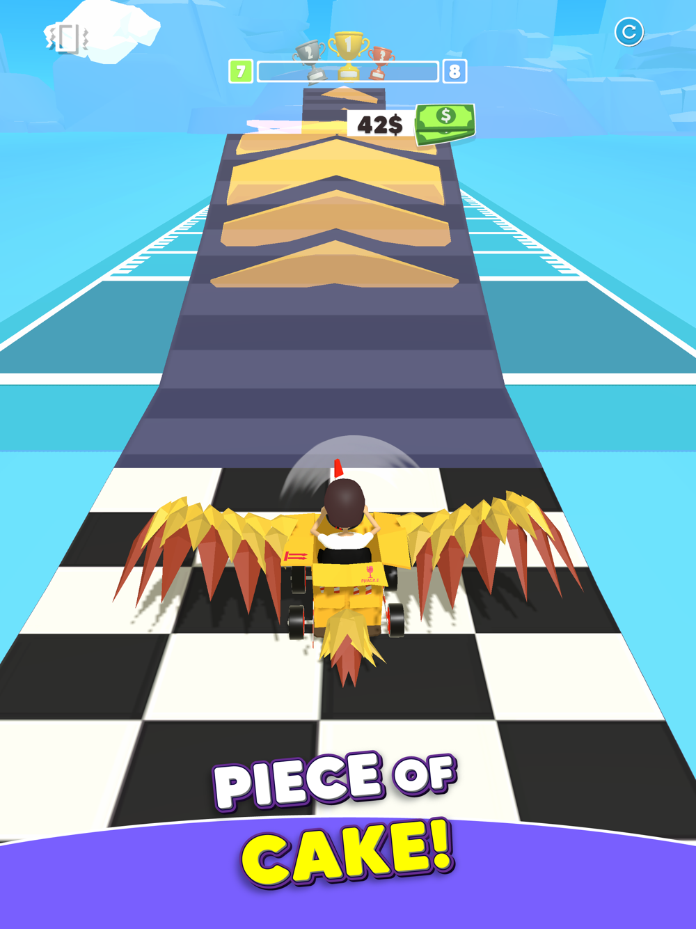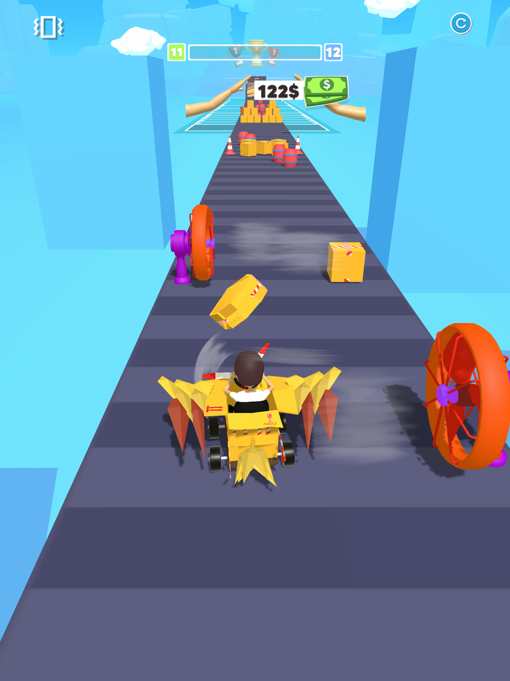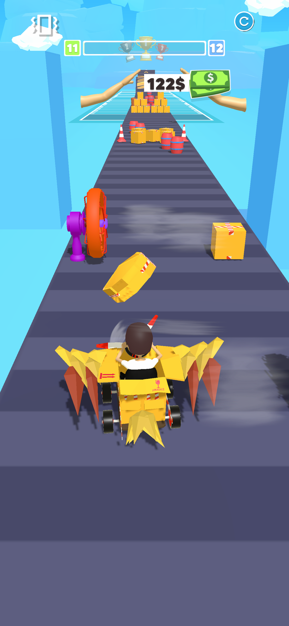 Whith the wheels on your box and start moving forward. Collect other boxes to build wings on the way and turn your cardboard box into a twin-propeller plane. Try to reach the longest distance you can at the end of the road.