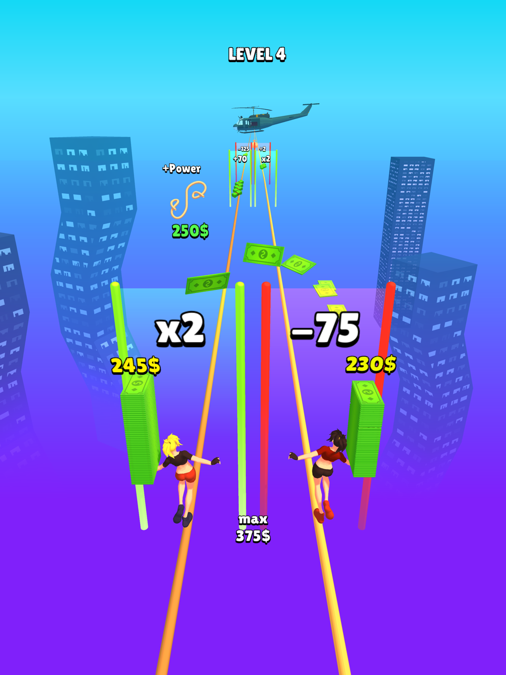 Try to collect money as much as you can but be careful, if you collect more than the rope can handle, you will lose... So shuffle it to balance between !!