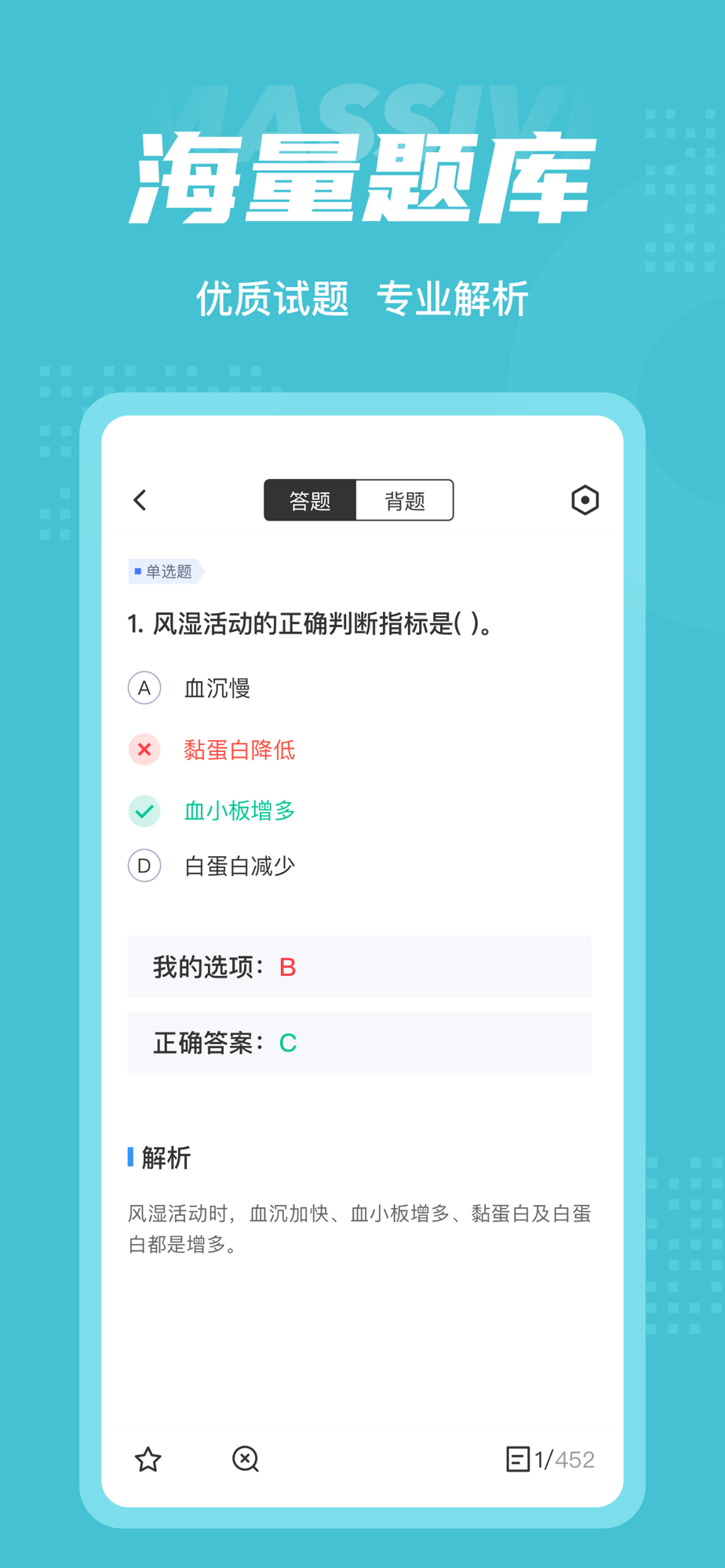 临床执业医师题库内含考点练习,全国通用卷以及地区卷模拟练习,以及按照固定考试比重的随机式的抽题的真题考场,成绩单实时记录考试数据,一点一滴的反馈考生近期学习状态以及自我正确率的提升,大大的给予考生通过考试的信心。