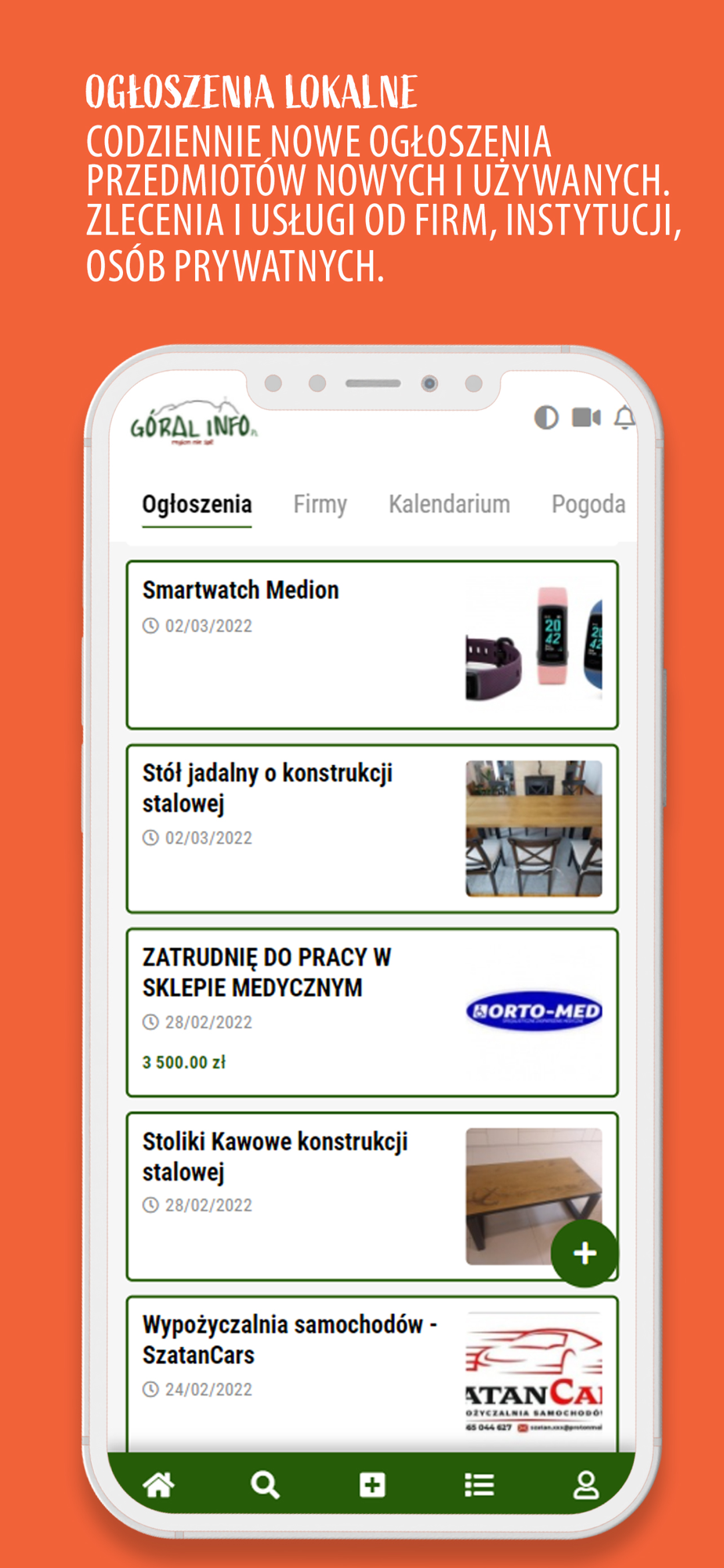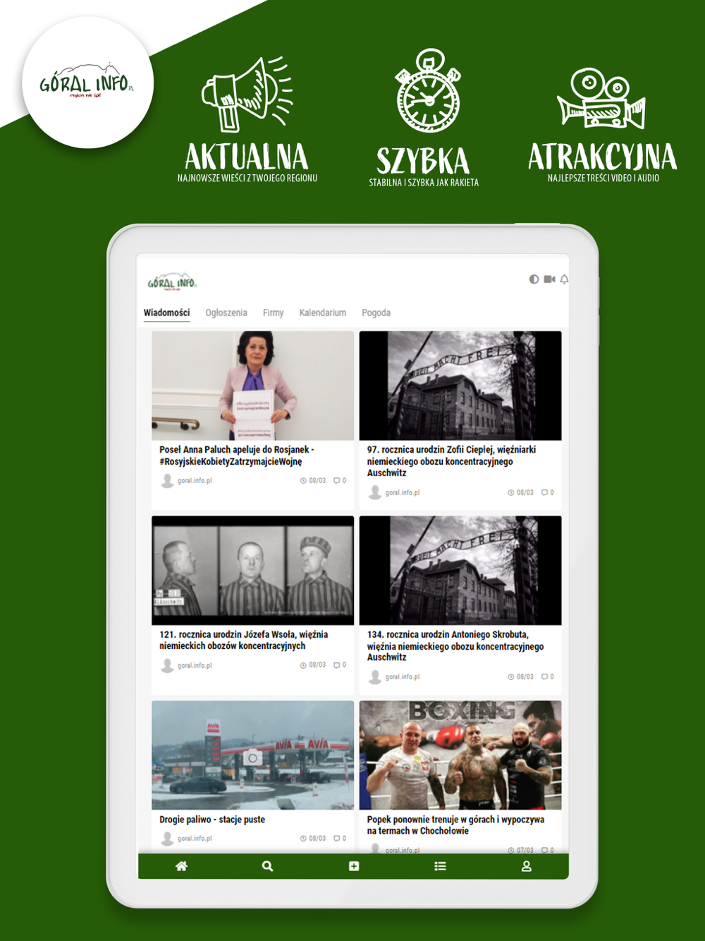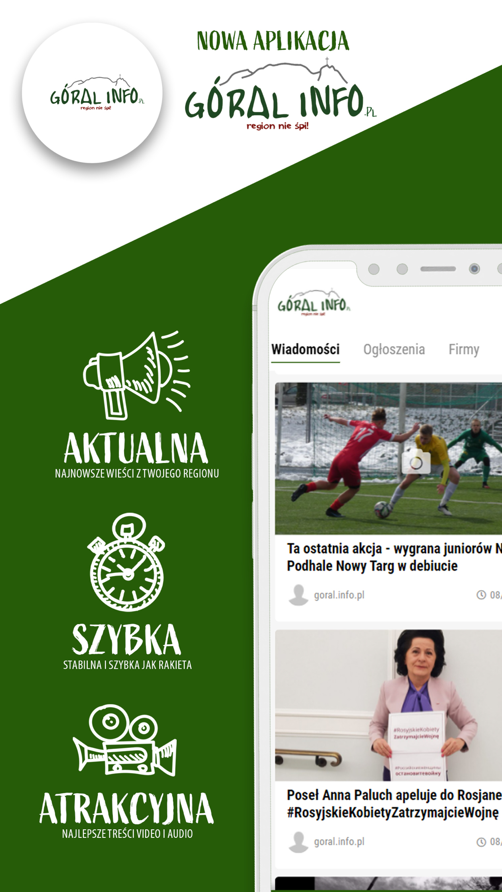 Aplikacja Góral Info to dostęp do codziennej dawki informacji z Podhala, Orawy, Spisza i Pienin. Wiadomości, informacje i ogłoszenia w wygodnej formie. Dzięki aplikacji Góral Info możesz dowiedzieć się o najważniejszych wydarzeniach w Zakopanem, Nowym Targu, na Podhalu, Orawie, Spiszu i w Pieninach, w miejscowościach powiatów tatrzańskiego i nowotarskiego. Z nami będziesz na bieżąco z tym co ważne w Twojej okolicy. W aplikacji Góral Info z łatwością dodasz ogłoszenie oraz znajdziesz lokalną firmę, z której usług chcesz skorzystać.