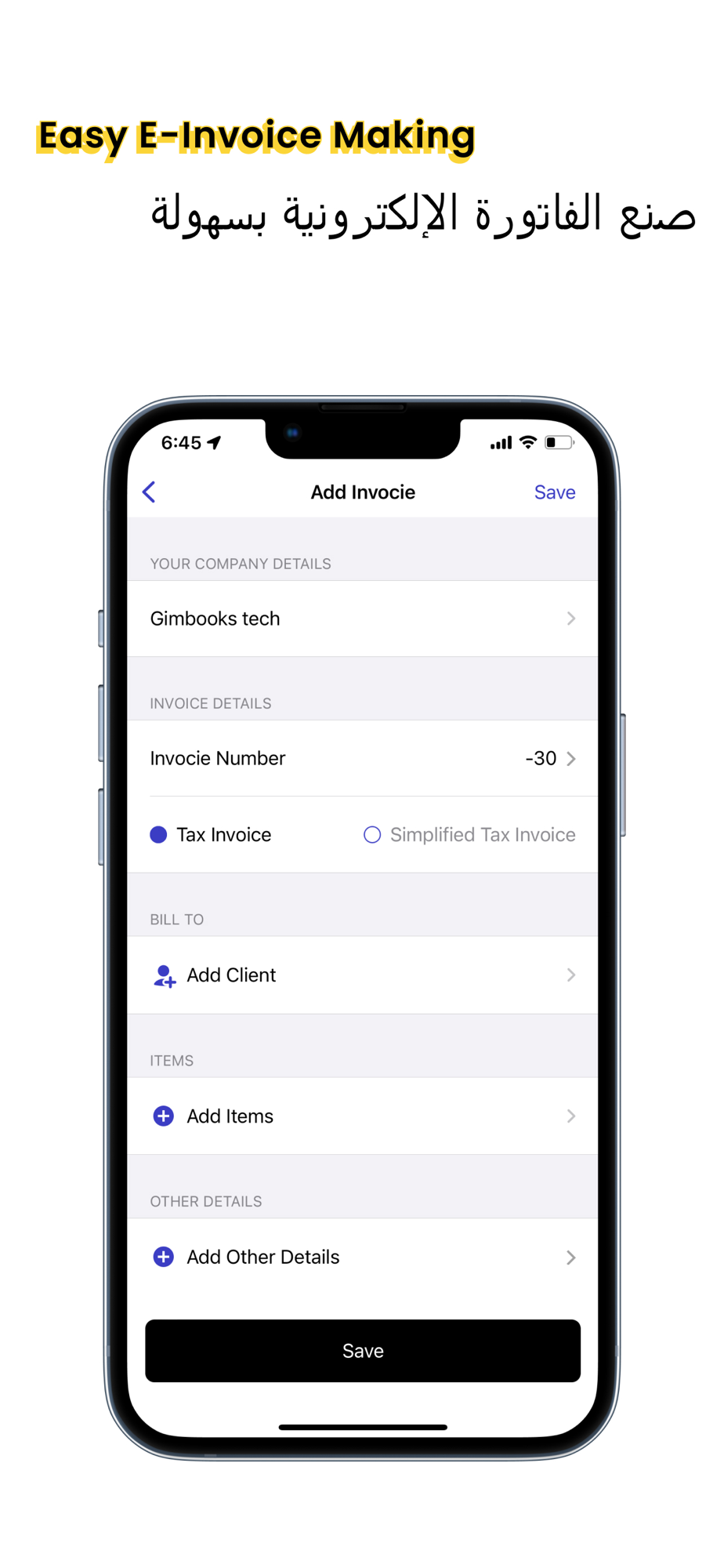 Invoice Maker by GimBooks provides an easy way to create Invoices, ZATCA Compliant E-Invoice with QR Codes and manage accounts. You can create and manage invoices, e-invoices. Manage your Inventory, bill book and your full business through ZATCA Compliant Easy Invoice by GimBooks.