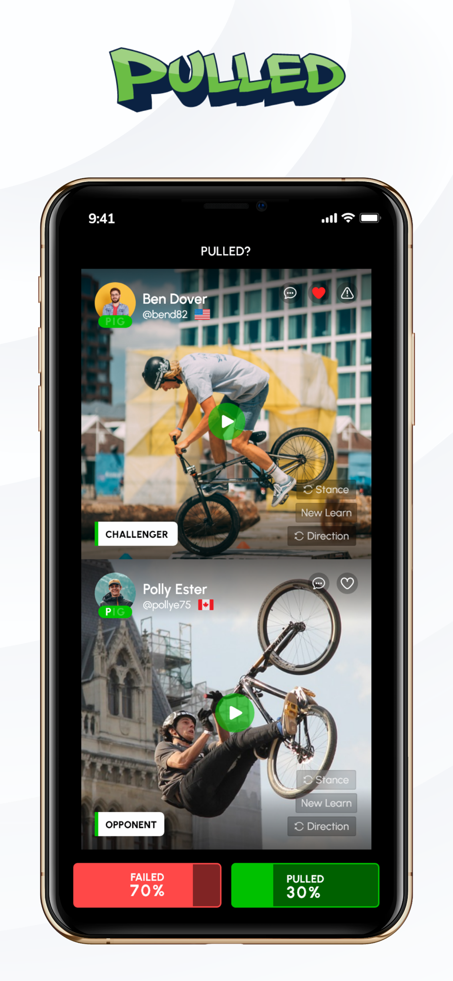 In this game of bike, skate or scoot, players can’t repeat a trick unless it’s on a different obstacle. Any disagreements during this skate, scooter or bike contest are voted on and resolved by other app users. The video feed is used to determine who’s at fault. The player voted against, receives a “fail.” Once this game with dirt jumps has concluded, you can share a compilation of your action sport game to any social media network or even add it to your own profile in Pulled for people to enjoy.