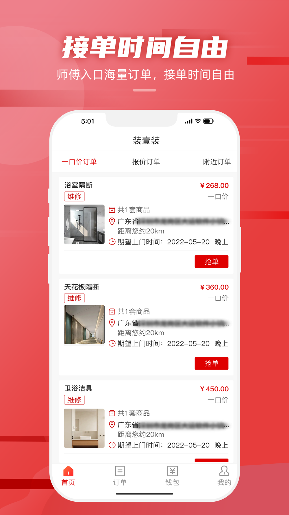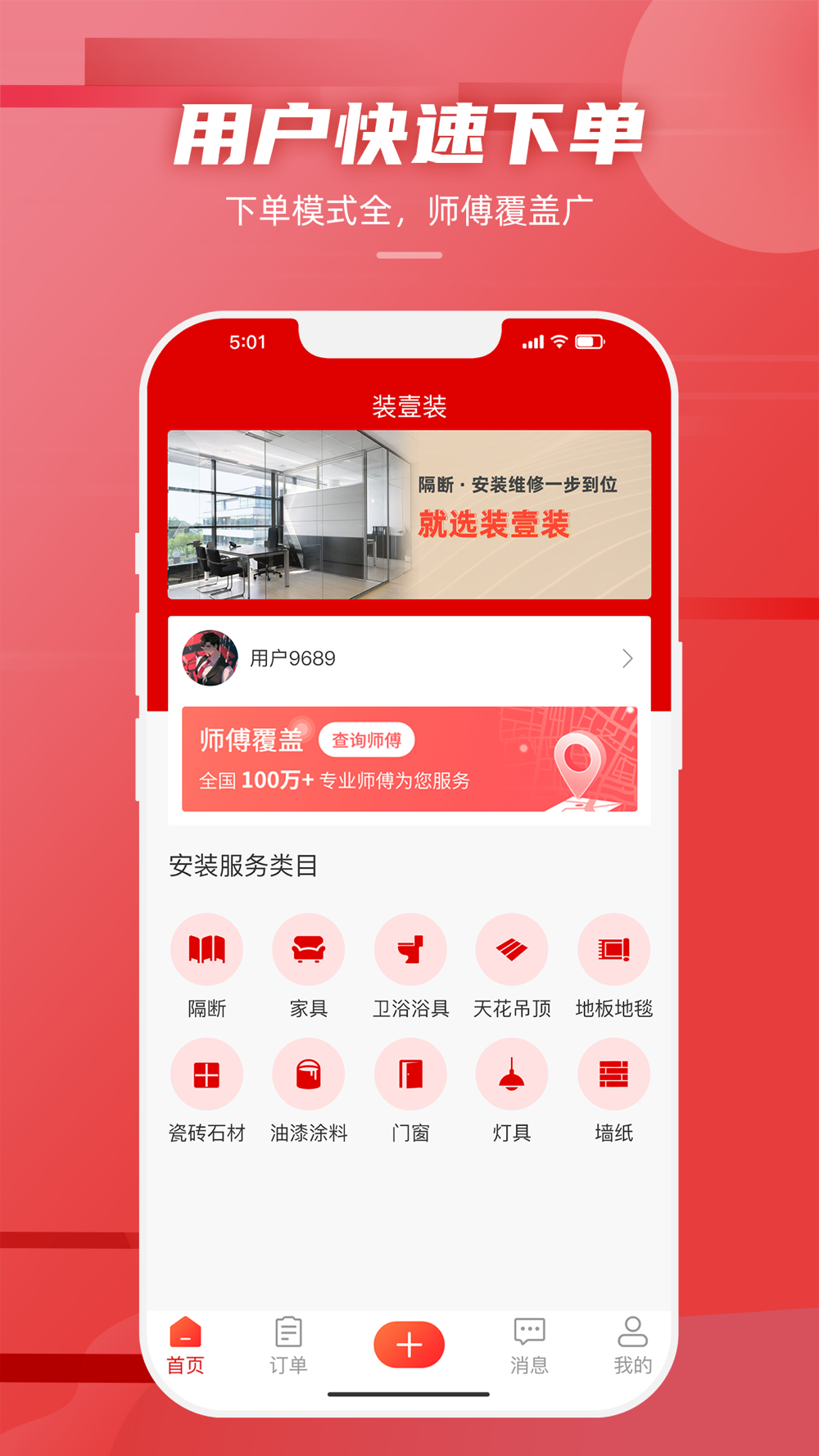 专业从事工装上门服务的平台,平台内可下单找师傅,也可入驻自由接单。业务包括维修 、安装、测量等服务。装壹装致力于为消费者,师傅搭建一个“品质好、安全好”的一站 式工装服务平台,以期推动工装服务发展标准化,改善工装消费服务体验。