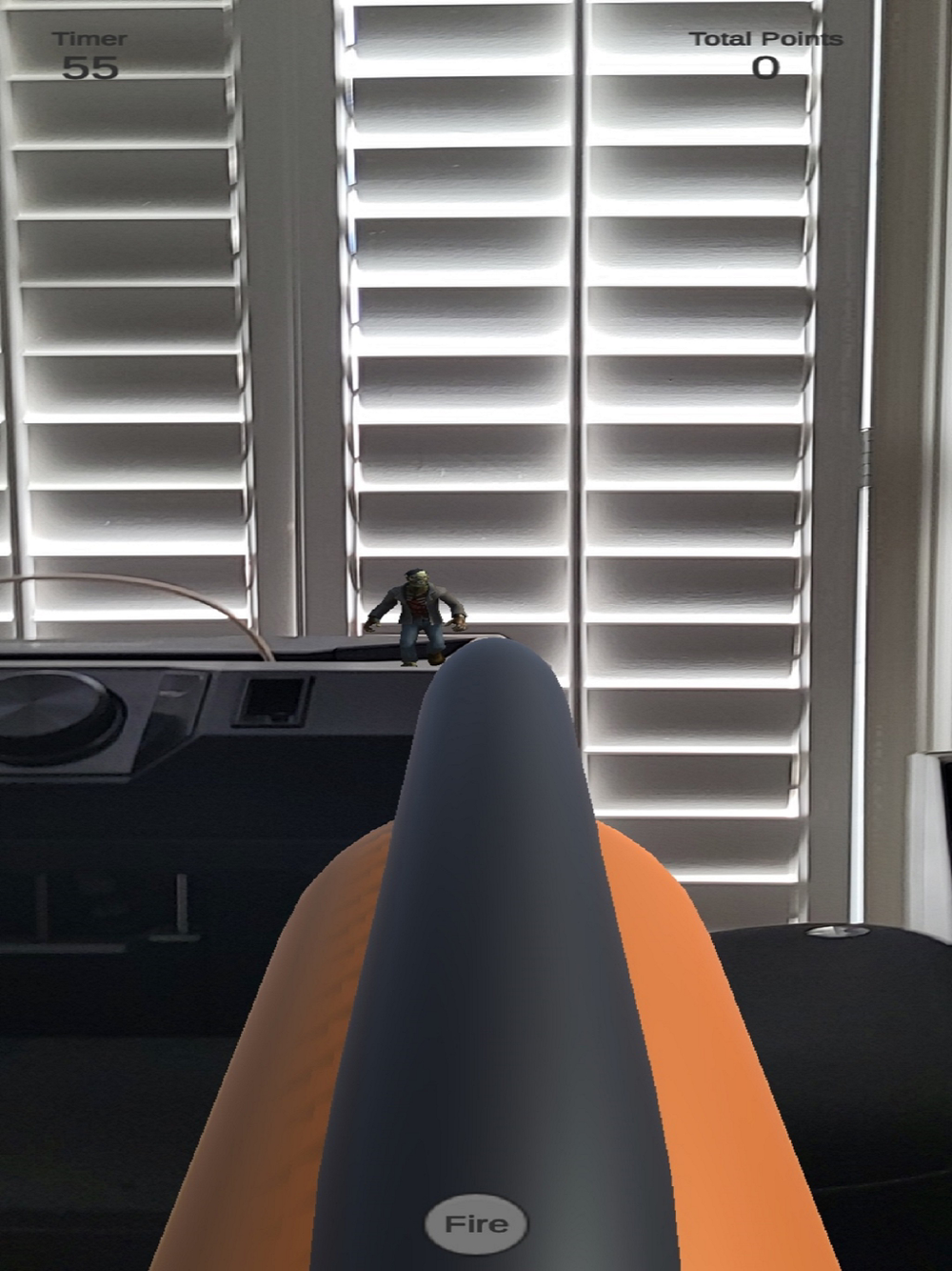 This is an Augmented Reality AR game where zombies spawn anywhere around you and slowly walk towards you. How many dead can you kill in 60 seconds. Only heads shots count. A little fun game for Halloween.