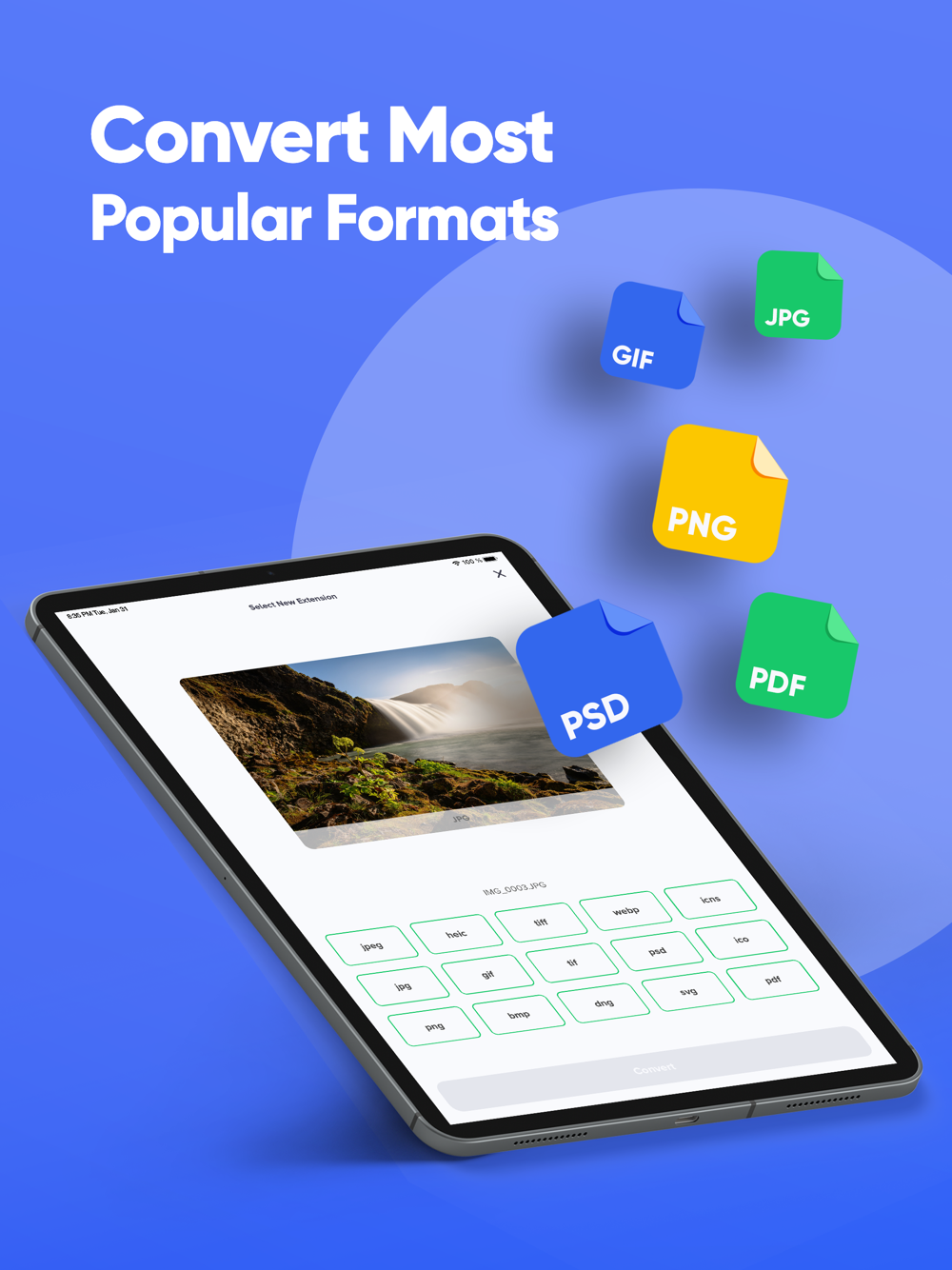 Image Converter app allows you easily convert your images from one format to another. All popular formats are supported: JPG, PNG, PDF, SVG, GIF, HEIC, PSD and many more!