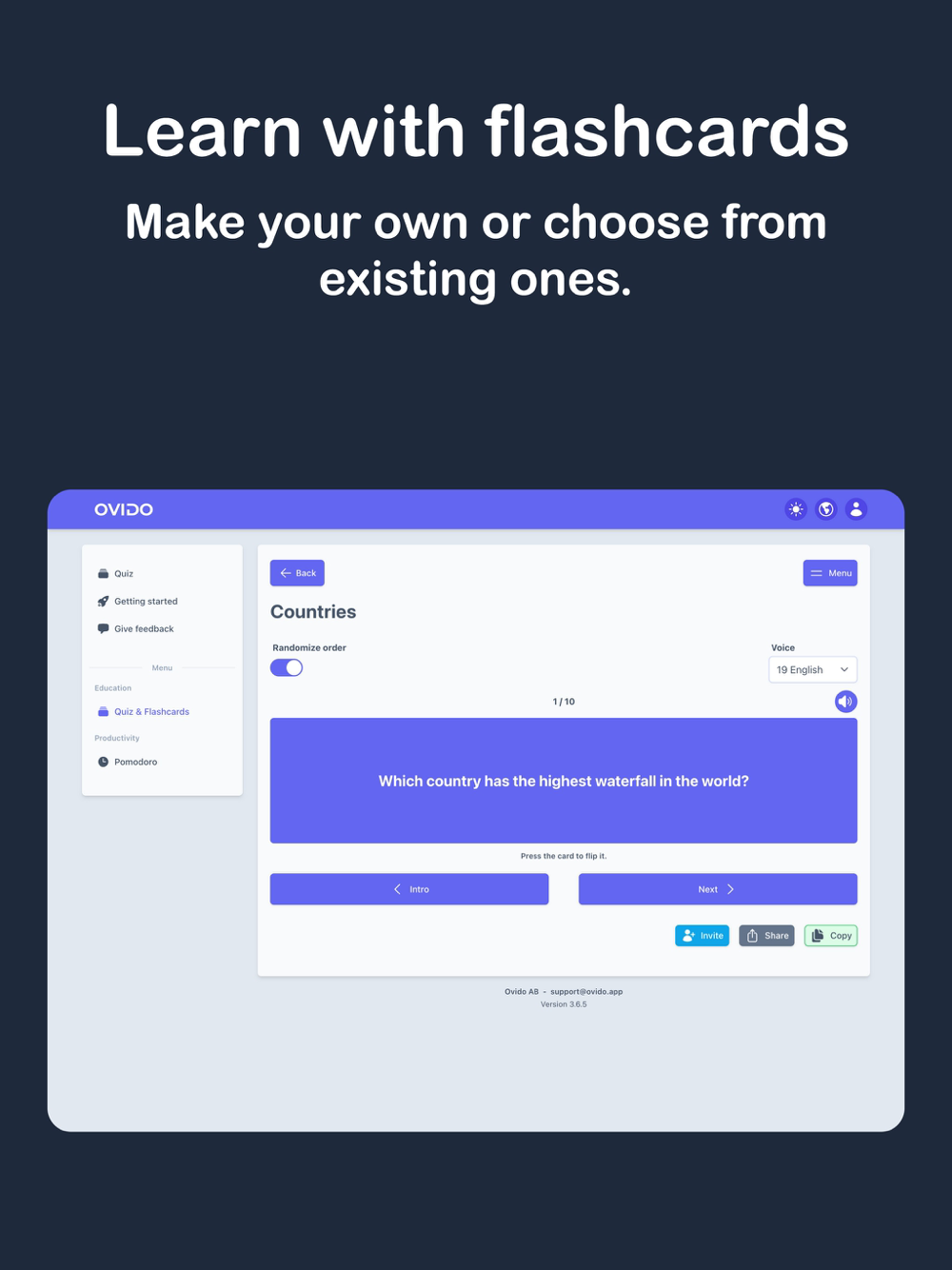 Looking for more ways to learn? Share your quiz sets and flashcards with friends or colleagues, and discover content created by other Ovido users. Together, you can uncover new topics, trade study tips, and motivate each other to hit your learning goals faster.