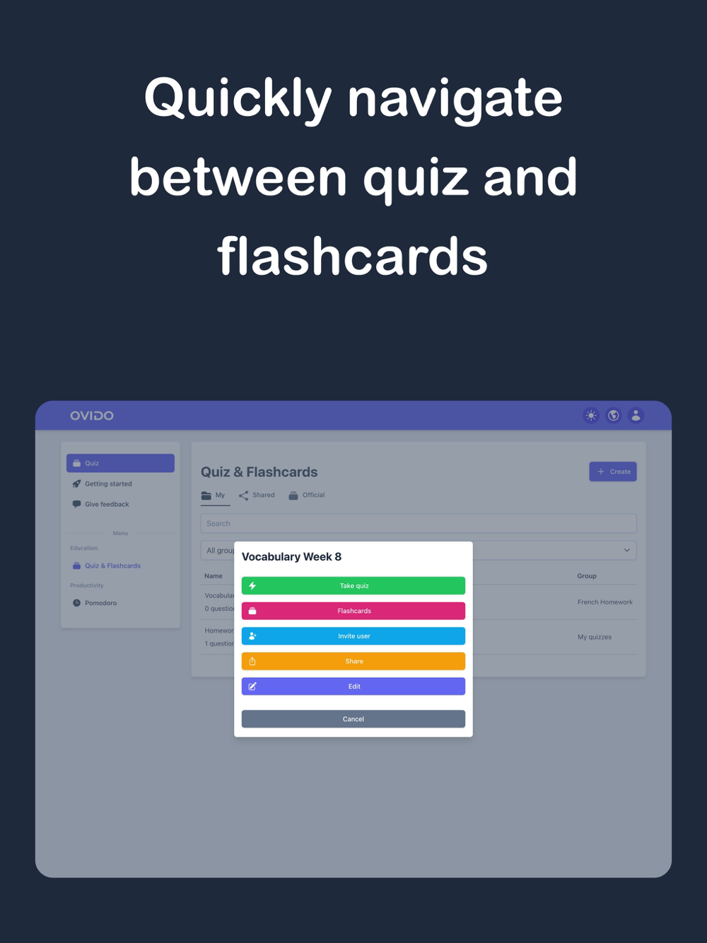 Ovido is the ultimate study app for anyone looking to improve their vocabulary, learn languages, and create engaging quizzes. Whether you’re a student mastering new words, a teacher seeking a fun classroom tool, or a lifelong learner exploring fresh topics, Ovido makes studying simple, interactive, and effective. Our user-friendly interface helps you build custom quizzes, generate flashcards, and share your creations with friends—all in one powerful platform.