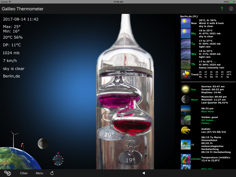 A virtual Galileo Thermometer with real Temperature and Weather Data. Temperature Display, Windchill Temperature, Air Humidity, Wind Speed, Barometer. No need to select a City, due to automatic location determination the progam searches the next Weather Station automatically.