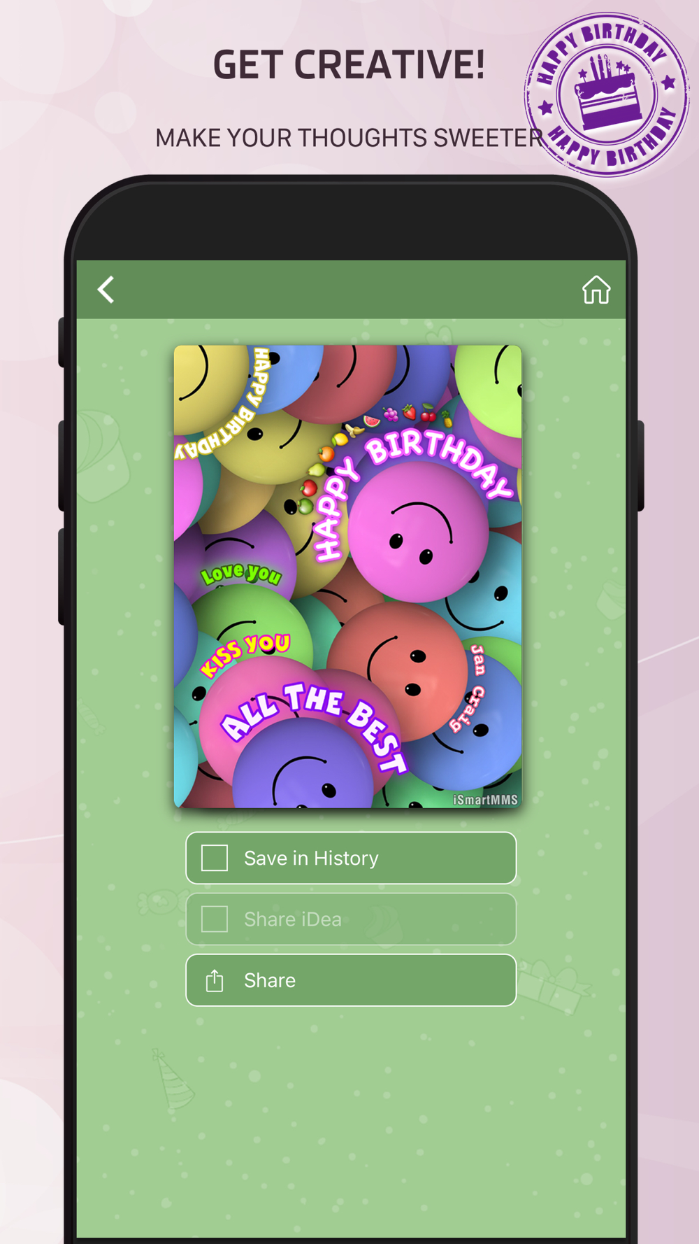 "BirthDay cards free" is absolutely for free, but with ads. If you like the app then you might be interested in its full version - "iSmartMMS". "iSmartMMS" has a huge Gallery of photos and images for any occasions. And unlike the birthday version "iSmartMMS" allows you to use your own photos and pics if you’re not satisfied with the standard gallery.
