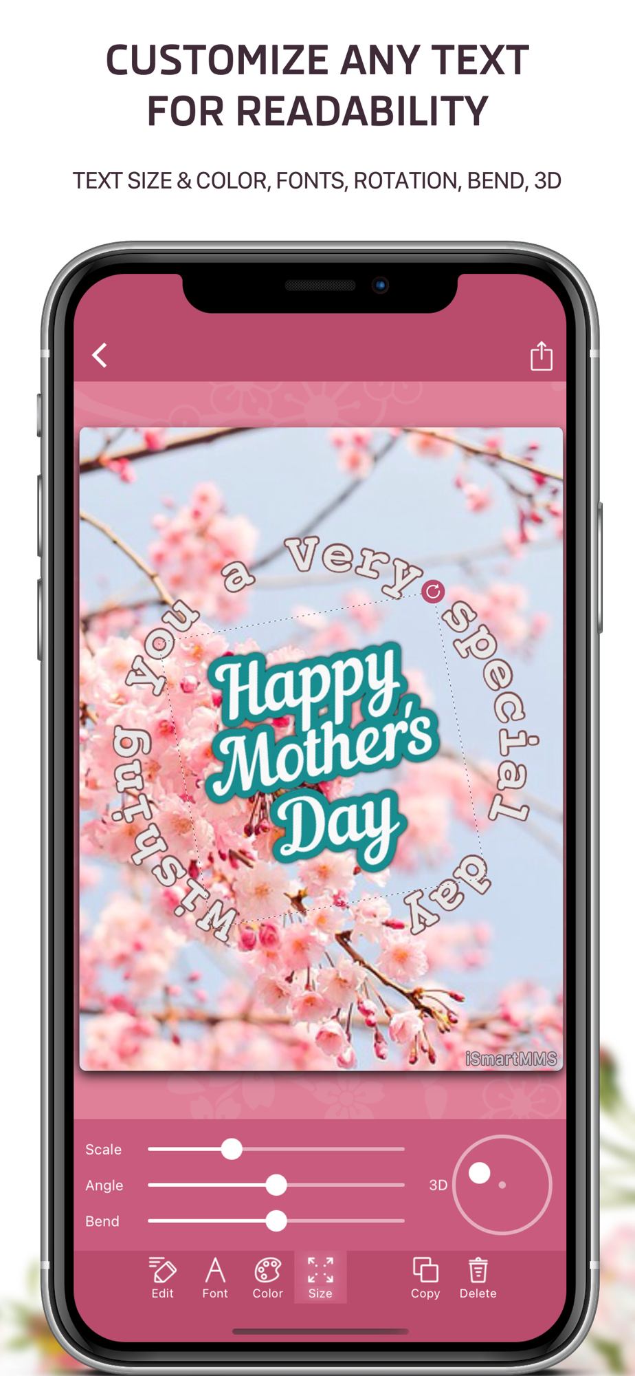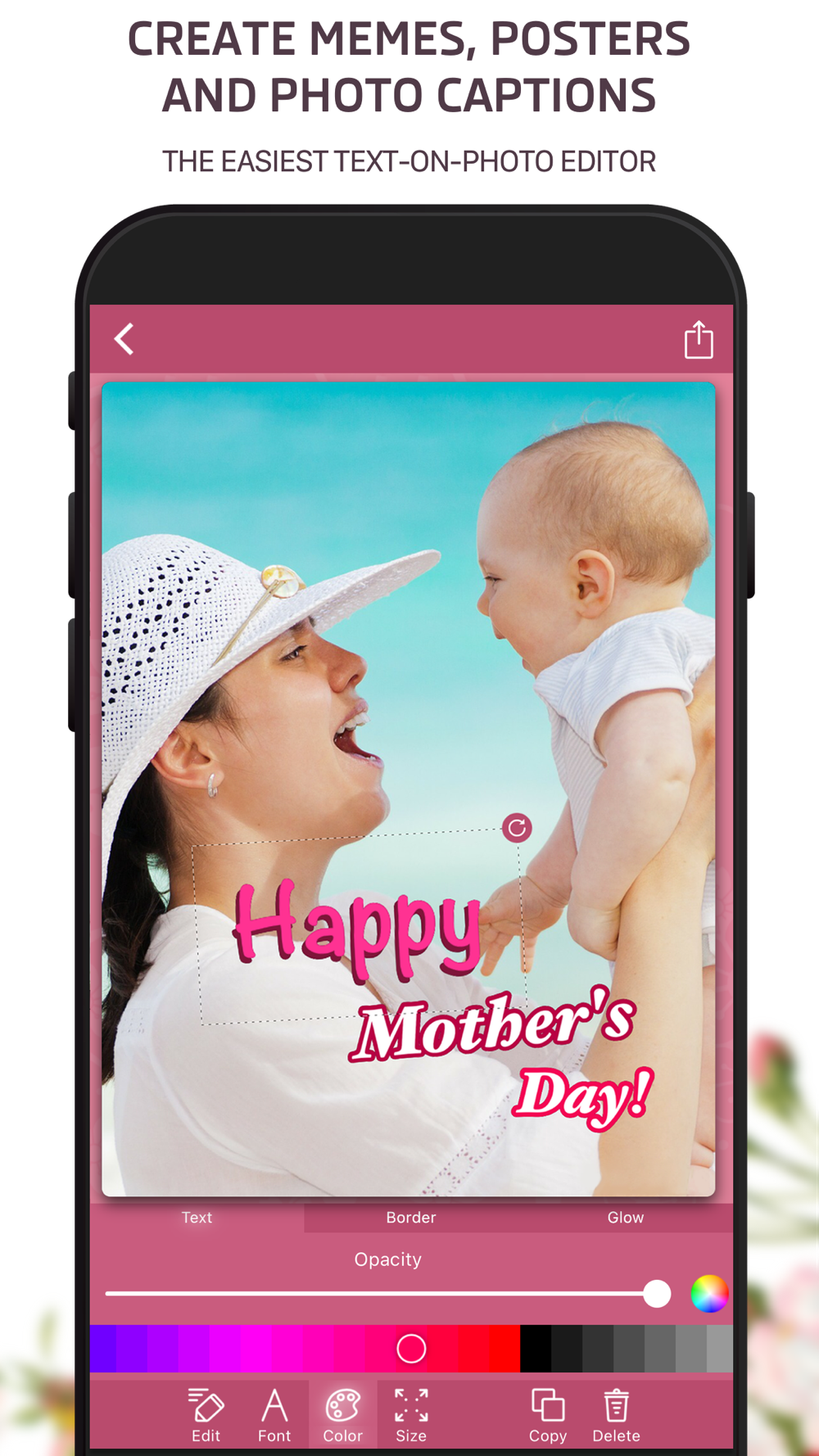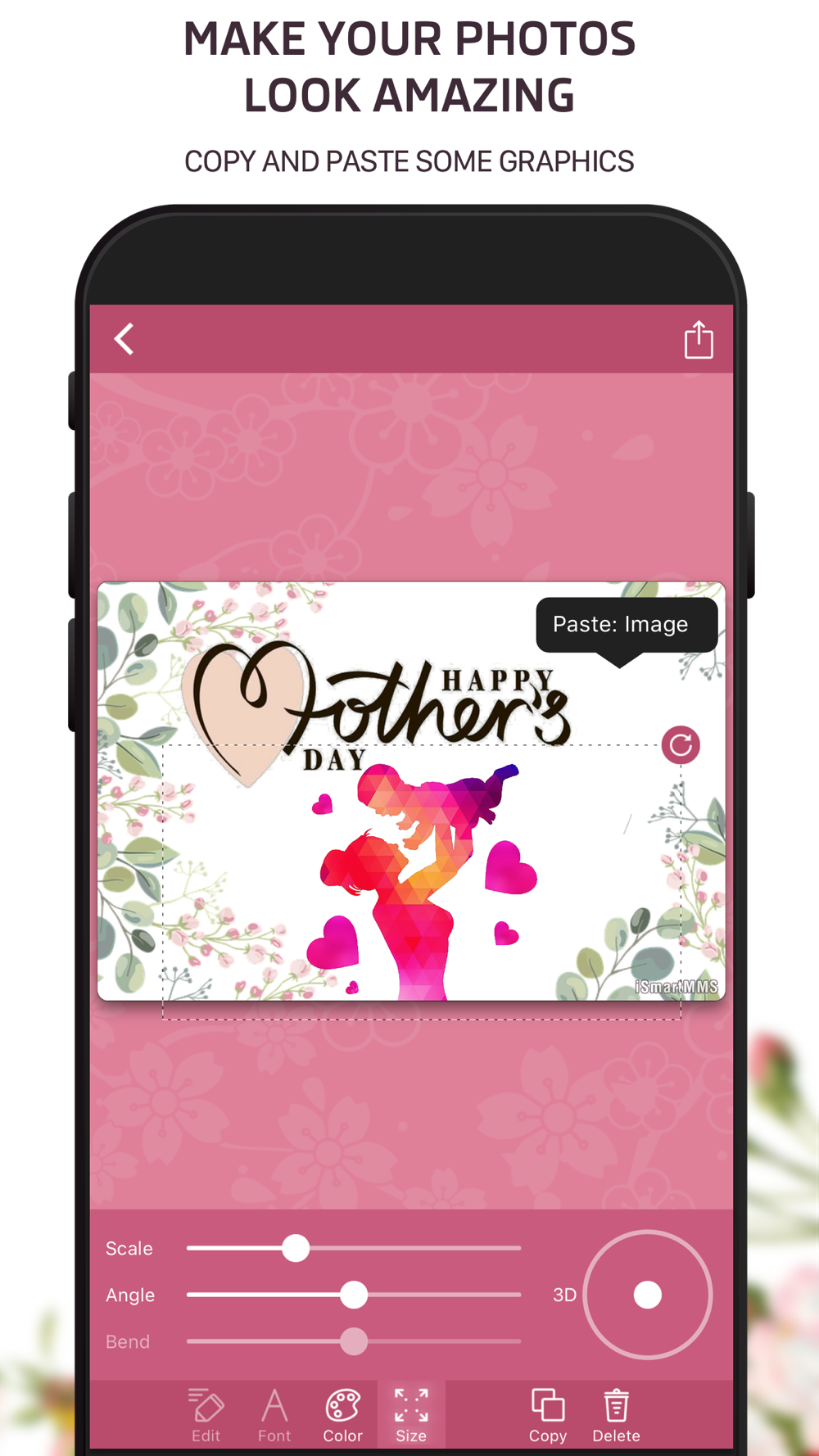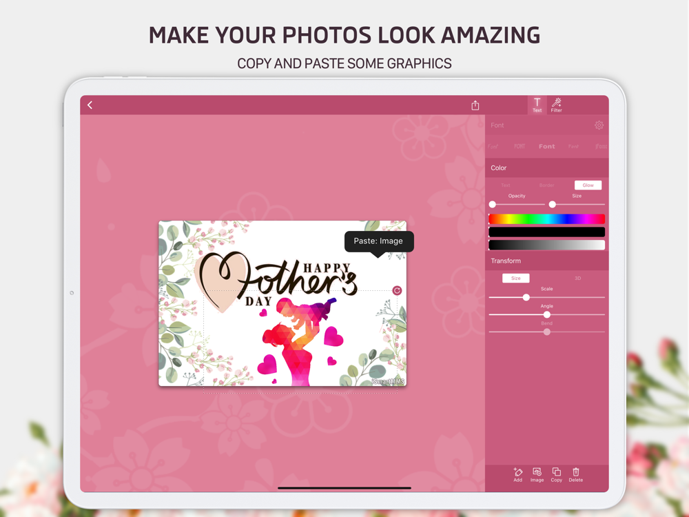 Double tap on the selected picture and you can start adding a greeting text on it easily. The app provides you with all text editing features: size, font, color, transparency, shadow and arrangement.