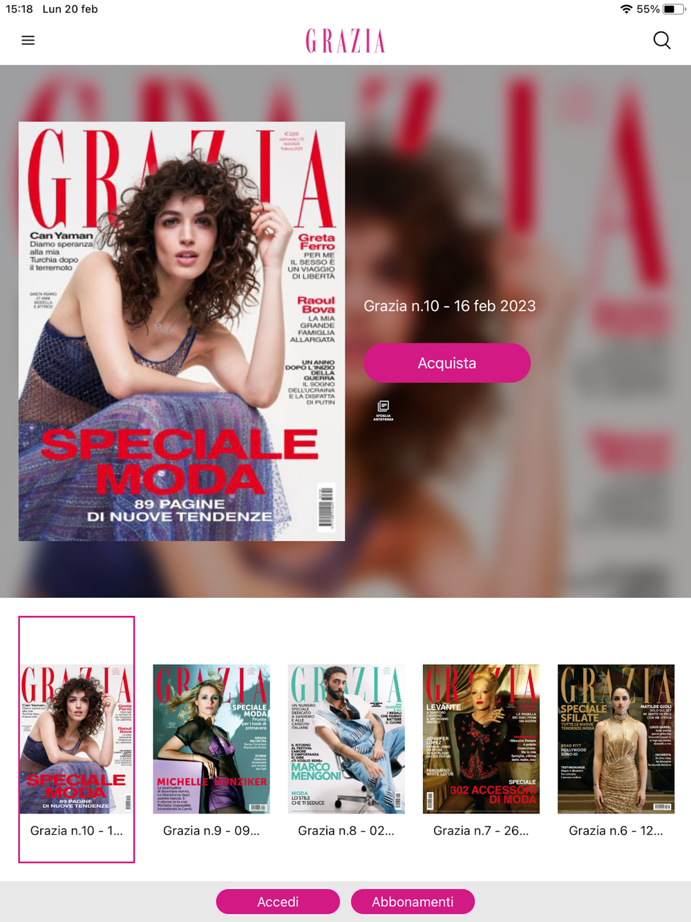 • If you have an active subscription to the paper version of Grazia, you can read the digital version on this App! Log in (from Menu - Account - Login) and always bring your favorite magazine with you.