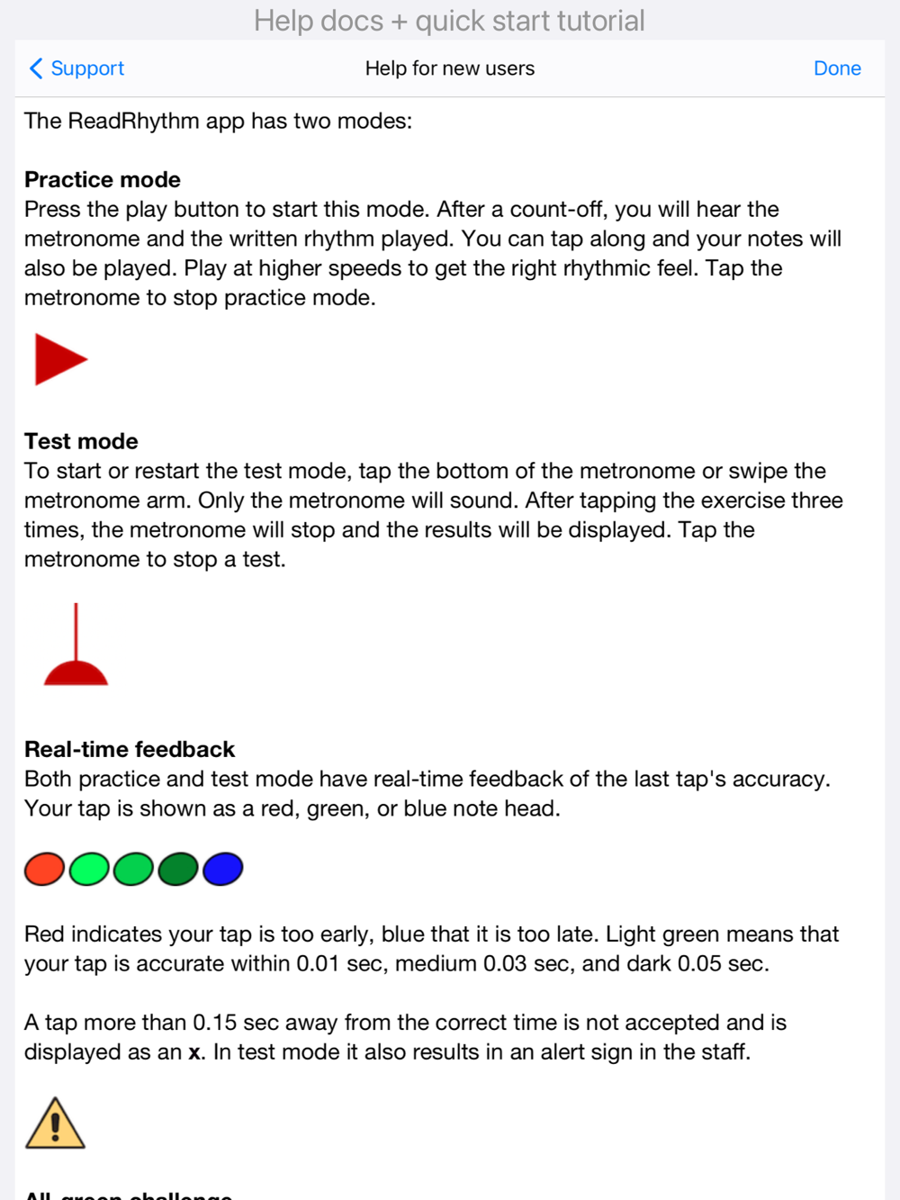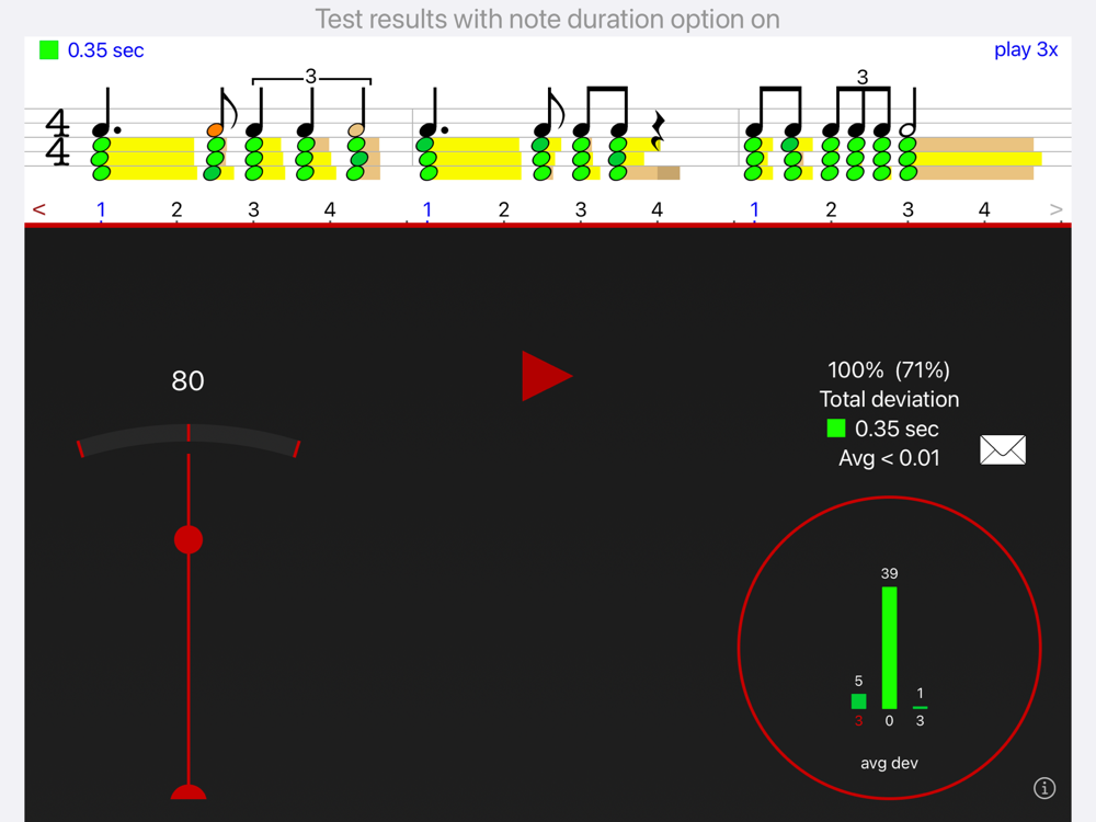 - Test mode: hear the metronome and read/tap the rhythm.