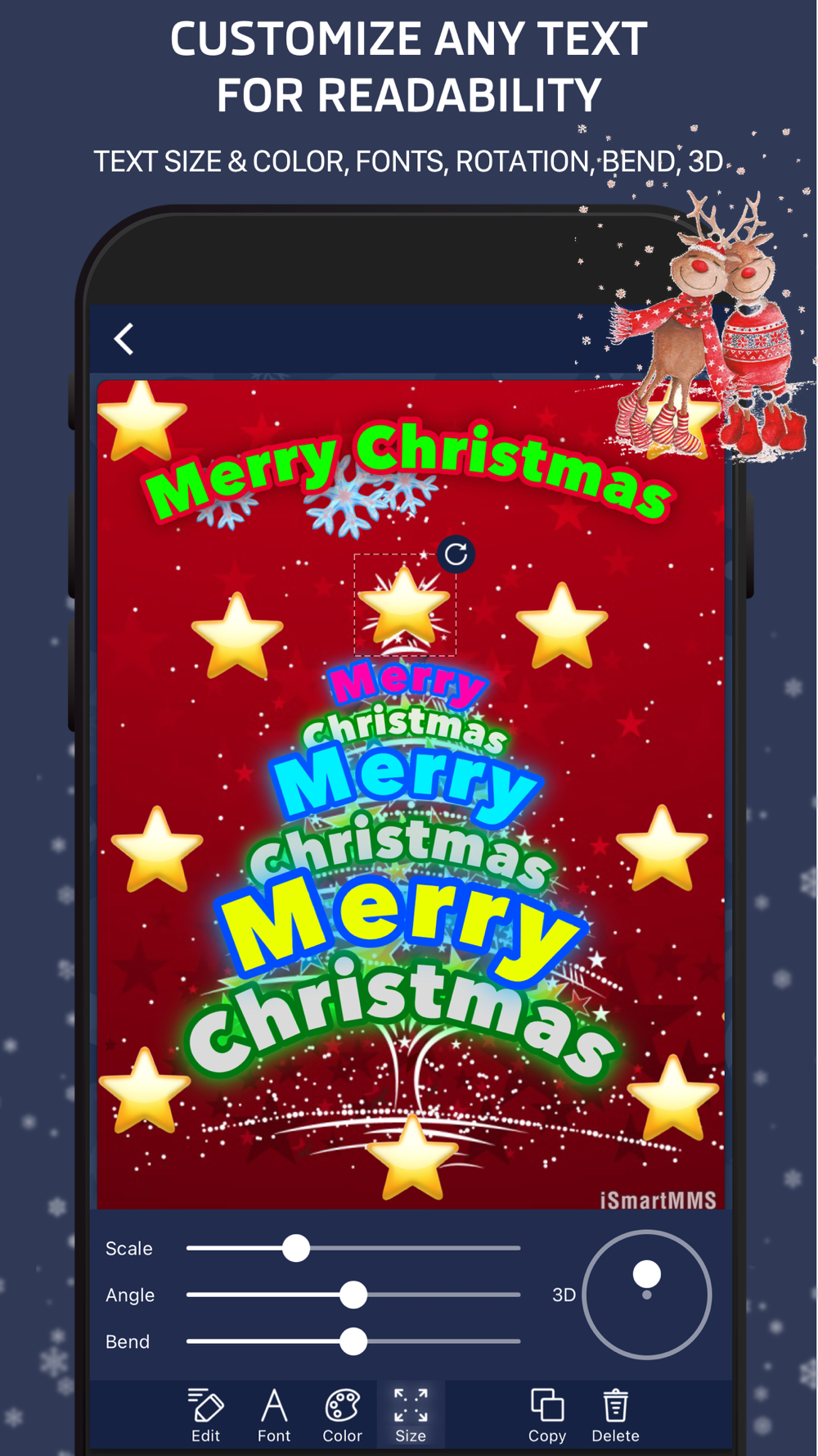 After you’ve chosen a picture you can put desirable greeting text on it. You can dress your greeting text with extraordinary font, custom size, color, and alignment, adding shadow, transparency and 3D effects.
