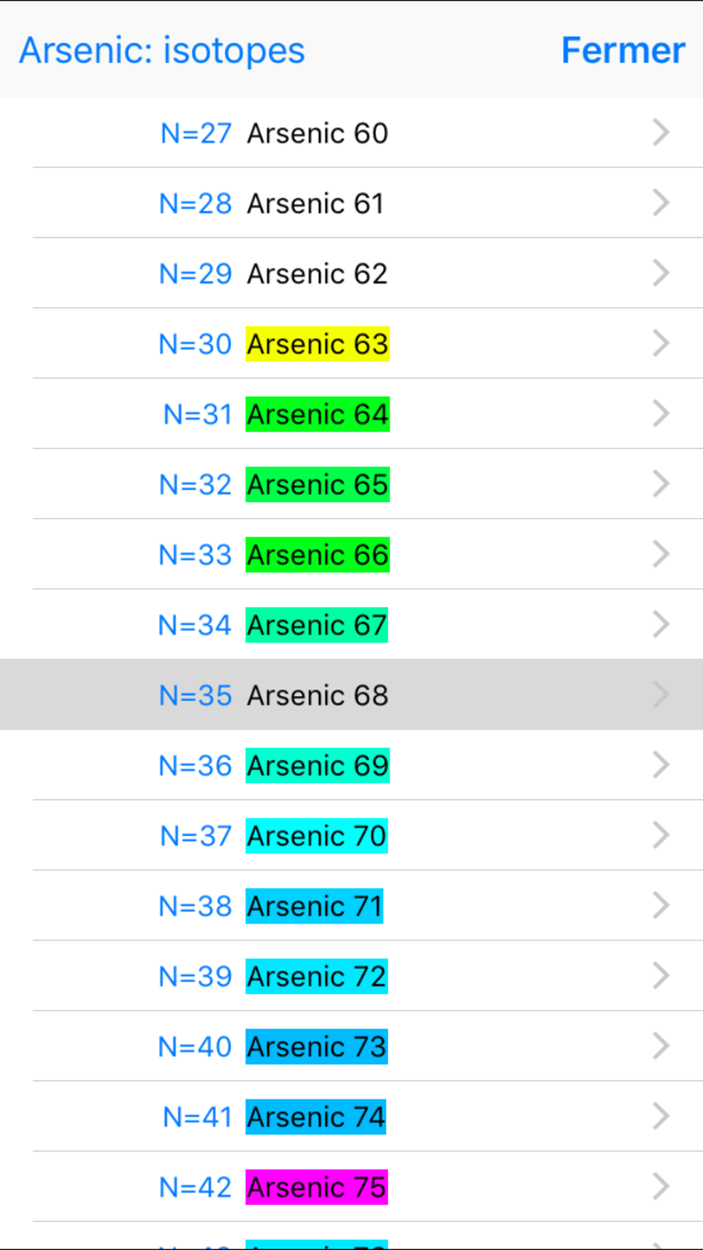 Touch a cell to get all data about a nuclide as well as its location in Mendeleiev's periodic table.